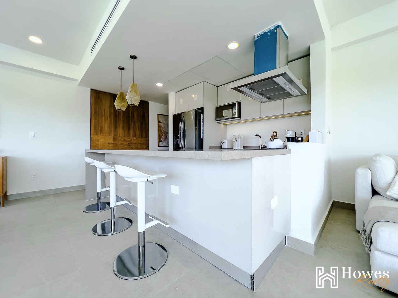 – Horseshoe bar with dark quartz cover.