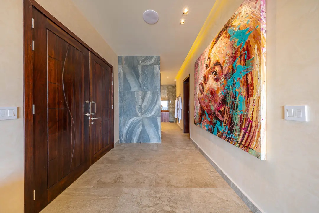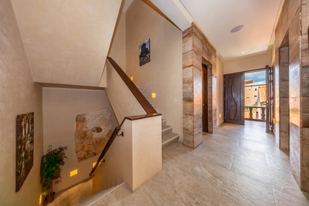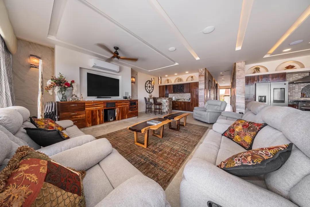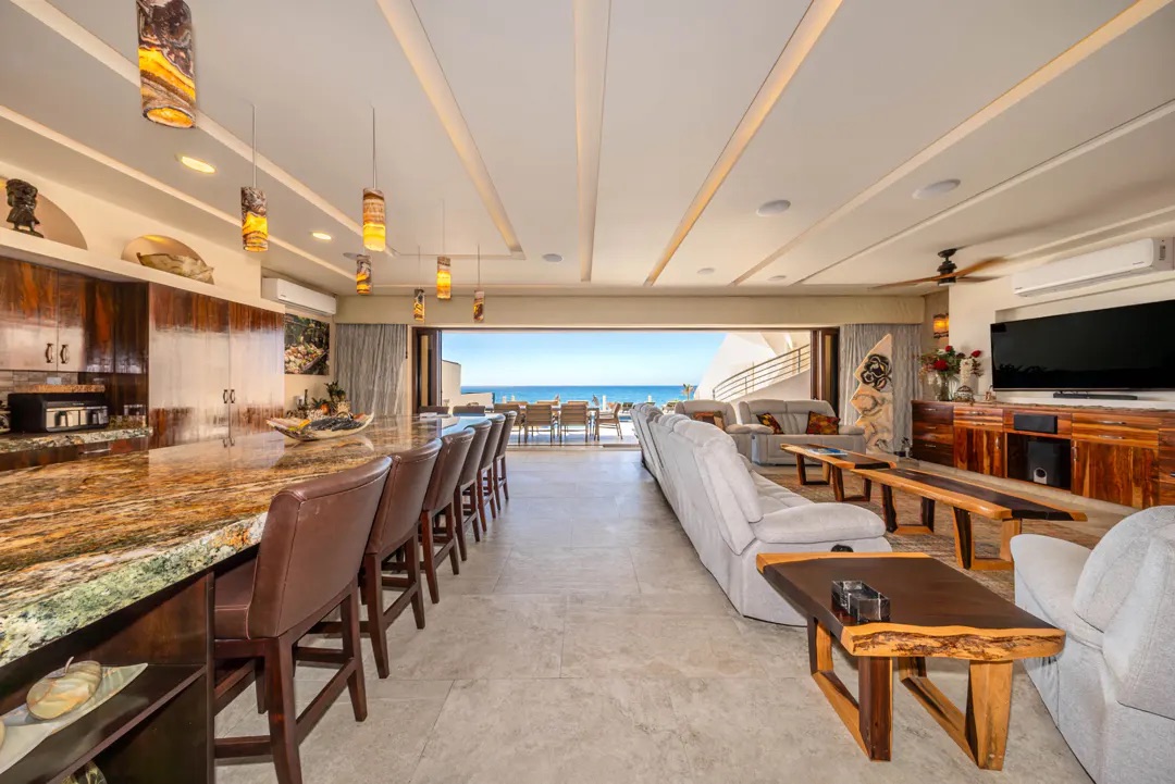 En el interior, un pasillo tipo galería enmarca una vista directa al horizonte del Caribe, conectando de forma discreta con espacios como oficina, recámara de visitas, medio baño, lavandería y despensa. El área principal se abre a un impresionante espacio de sala y comedor con vista al mar, complementado por un bar elegante, iluminación LED y un sistema de sonido integrado que eleva cada momento.
