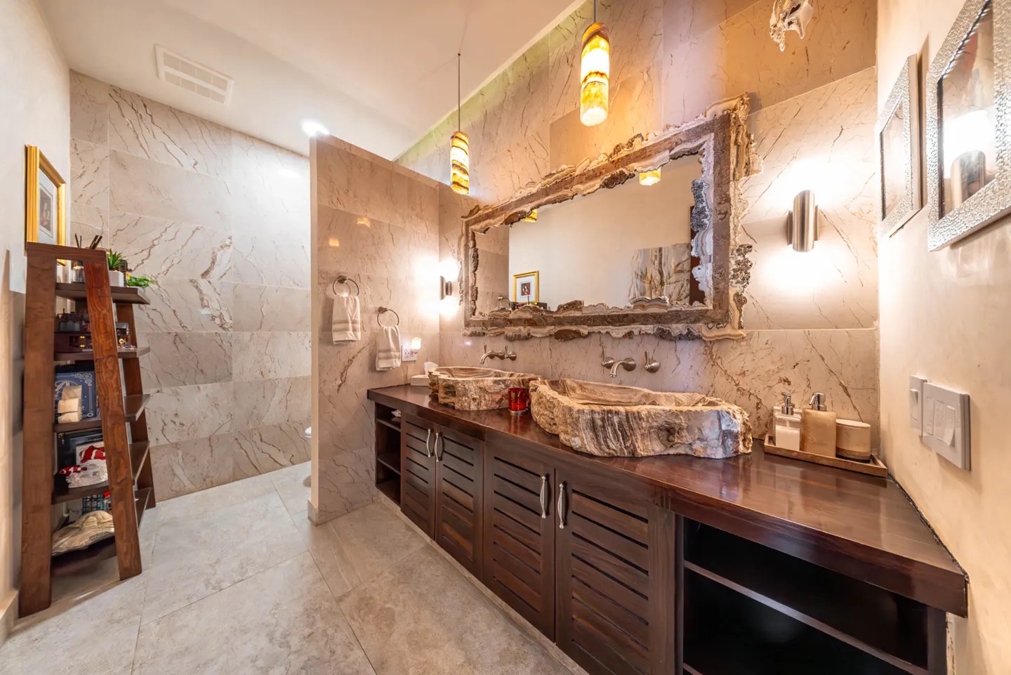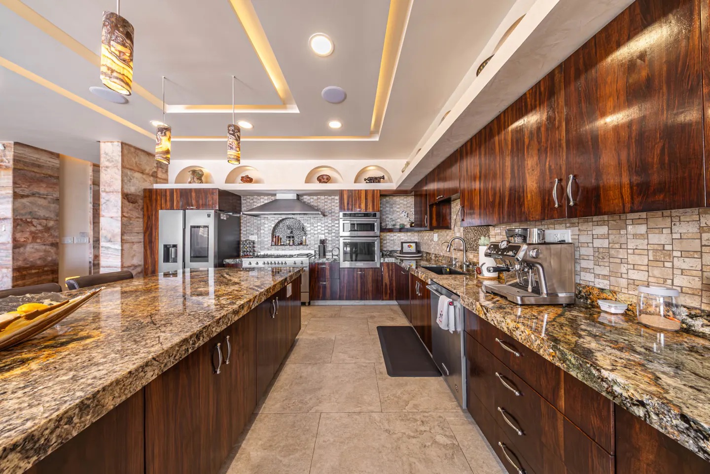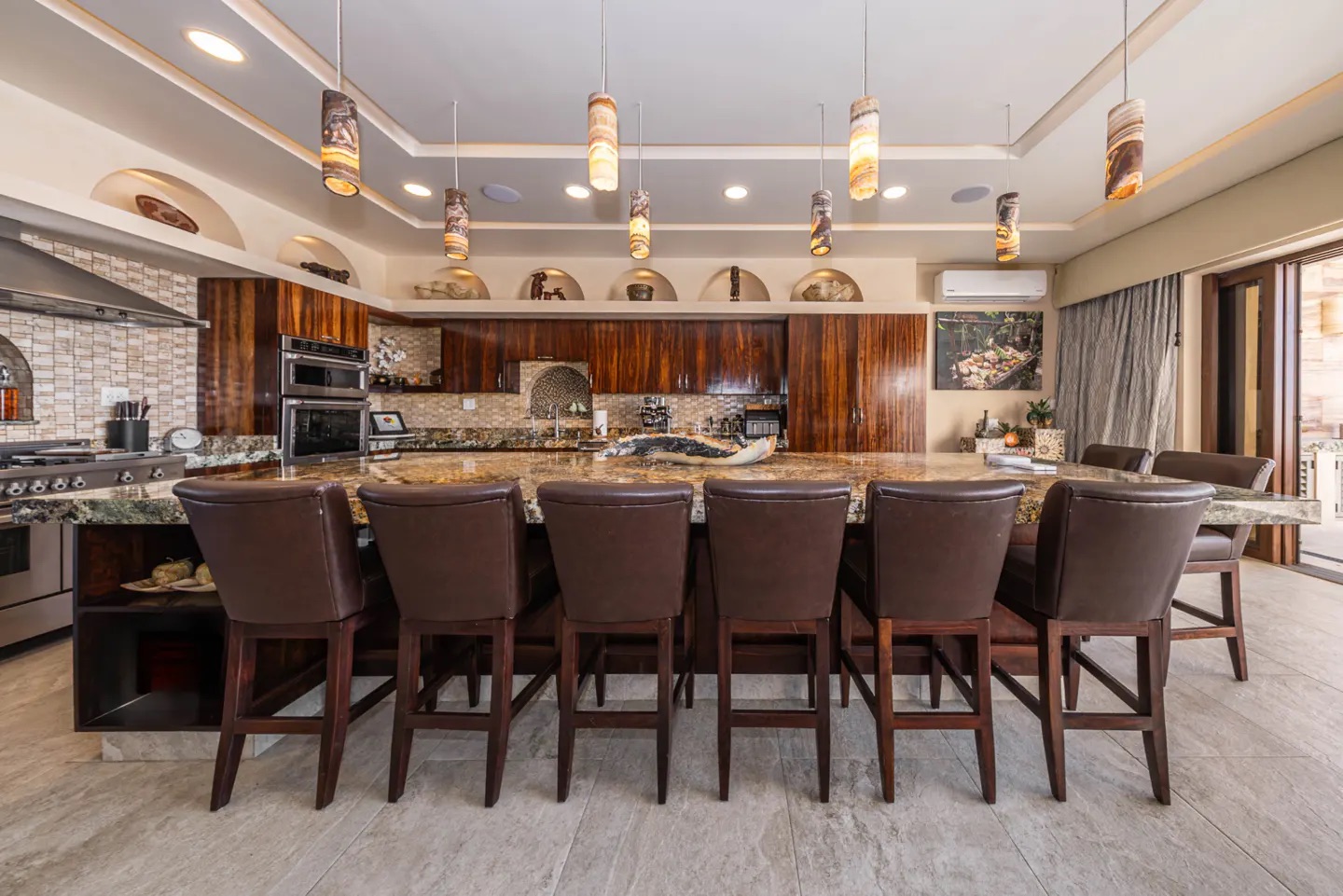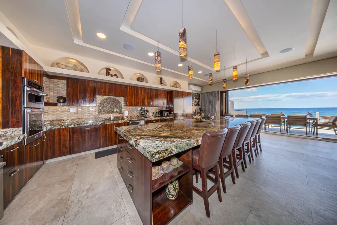 La cocina es una pieza central del hogar: amplia, funcional y visualmente impactante, con una gran isla de granito, carpintería en madera, iluminación en ónix y electrodomésticos empotrados, perfecta tanto para el día a día como para recibir invitados.