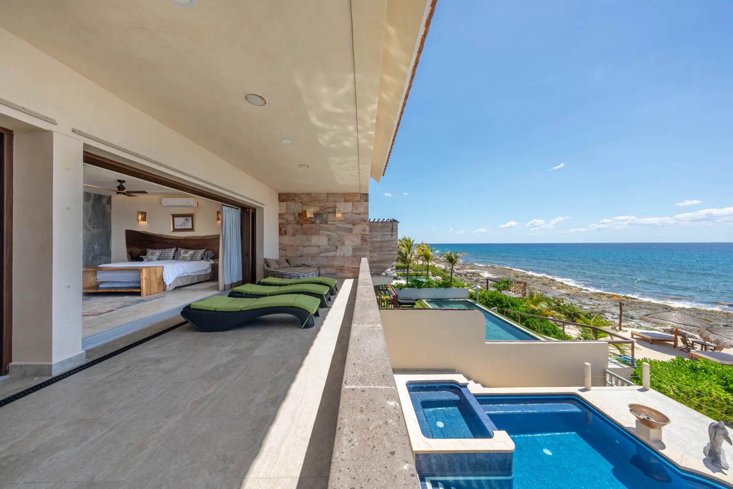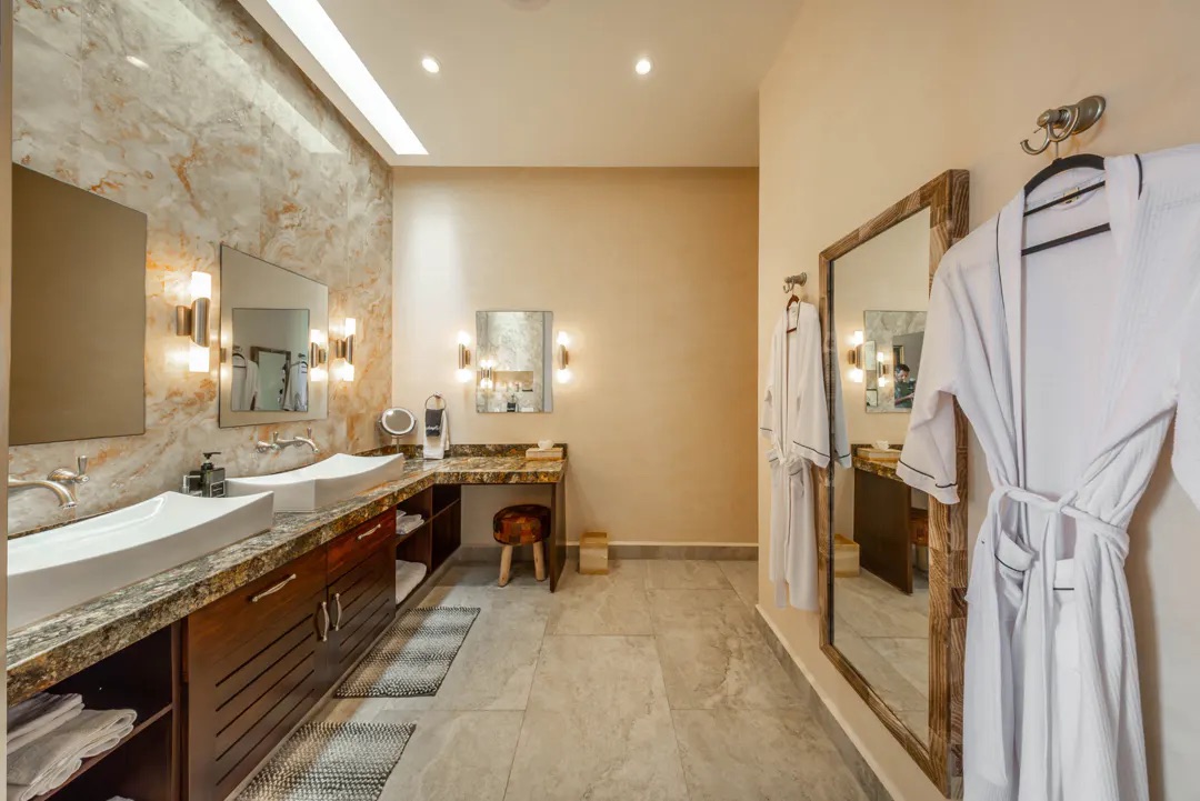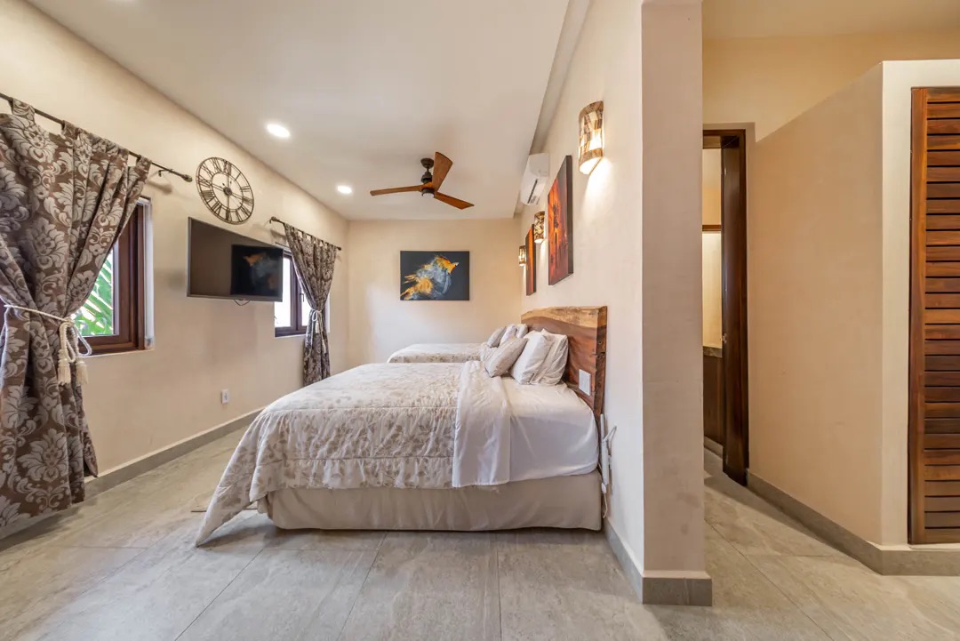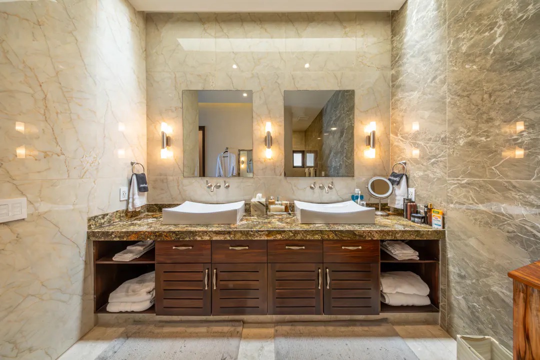 En la planta alta, la recámara principal ofrece vistas inigualables al amanecer sobre el Caribe, con vestidor doble, tocador y un baño en mármol con doble lavabo y regadera tipo lluvia. Comparte una amplia terraza con otra suite, conectada mediante una elegante escalera de caracol que lleva directamente al área de alberca. Las recámaras secundarias también cuentan con baño privado, vestidor y acabados de alta calidad, una de ellas con acceso independiente para mayor privacidad.
