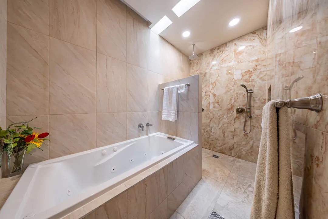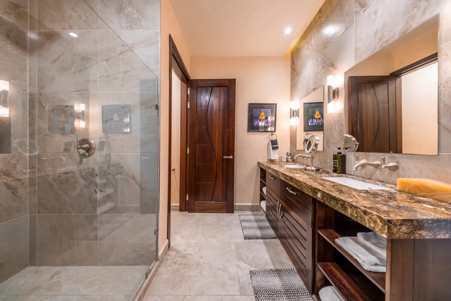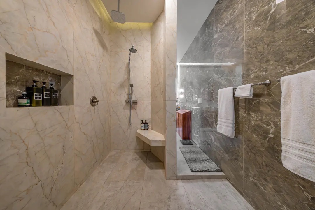 En la planta alta, la recámara principal ofrece vistas inigualables al amanecer sobre el Caribe, con vestidor doble, tocador y un baño en mármol con doble lavabo y regadera tipo lluvia. Comparte una amplia terraza con otra suite, conectada mediante una elegante escalera de caracol que lleva directamente al área de alberca. Las recámaras secundarias también cuentan con baño privado, vestidor y acabados de alta calidad, una de ellas con acceso independiente para mayor privacidad.