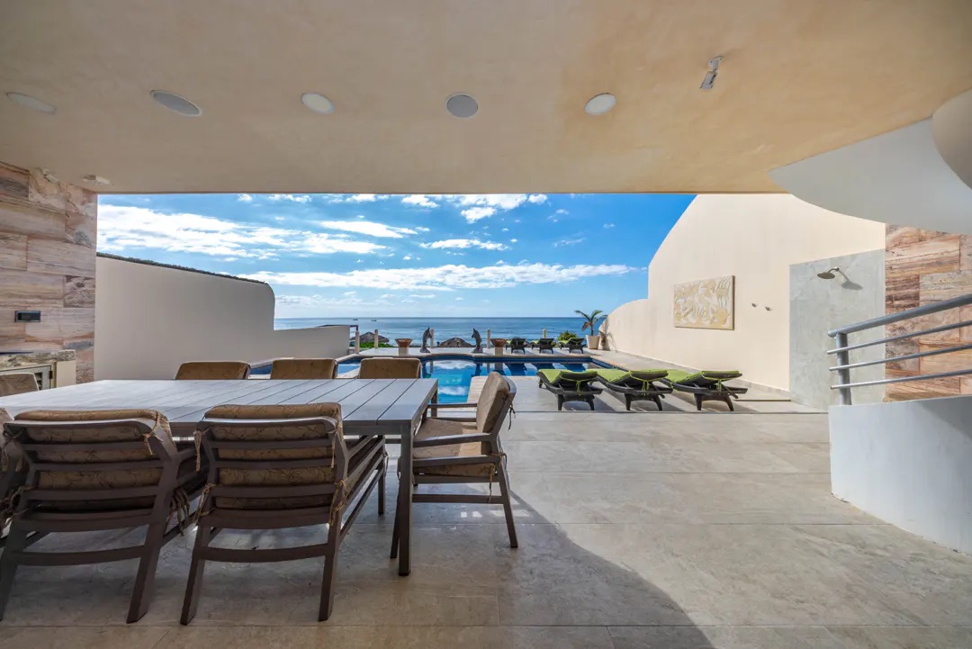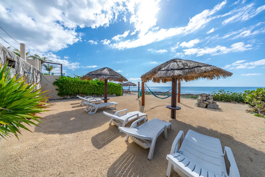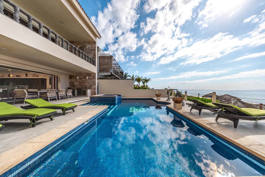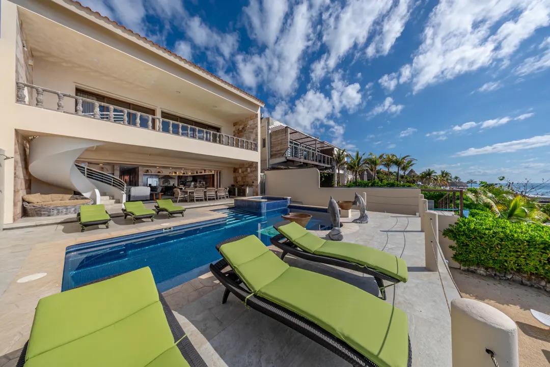 El exterior es simplemente espectacular: una amplia terraza cubierta recorre toda la propiedad, con área de bar, comedor al aire libre y espacios para relajarse. La alberca y el jacuzzi iluminados, junto con fuentes decorativas, crean el ambiente perfecto para disfrutar tanto de día como de noche. Desde aquí, una escalera de piedra conduce a la playa privada, equipada con palapas, hamacas y camastros, ofreciendo un entorno íntimo y natural.