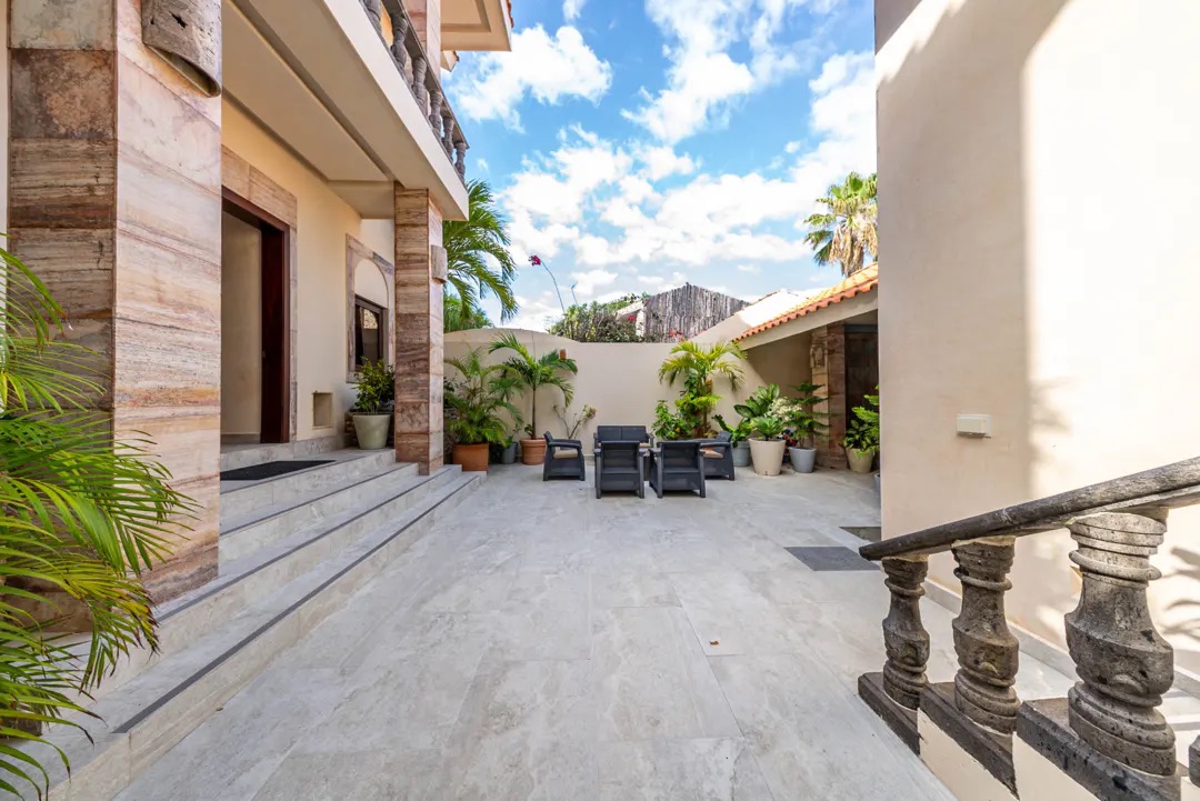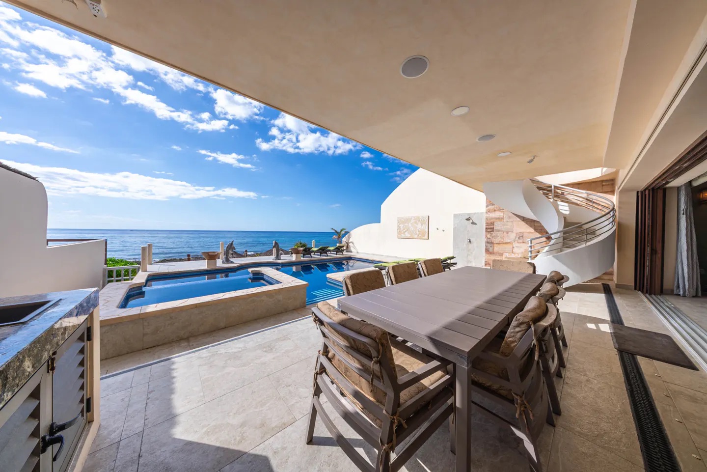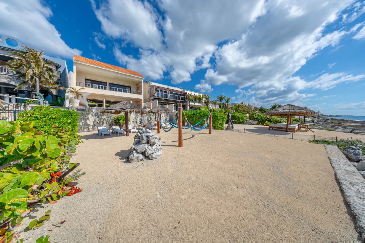 El exterior es simplemente espectacular: una amplia terraza cubierta recorre toda la propiedad, con área de bar, comedor al aire libre y espacios para relajarse. La alberca y el jacuzzi iluminados, junto con fuentes decorativas, crean el ambiente perfecto para disfrutar tanto de día como de noche. Desde aquí, una escalera de piedra conduce a la playa privada, equipada con palapas, hamacas y camastros, ofreciendo un entorno íntimo y natural.
