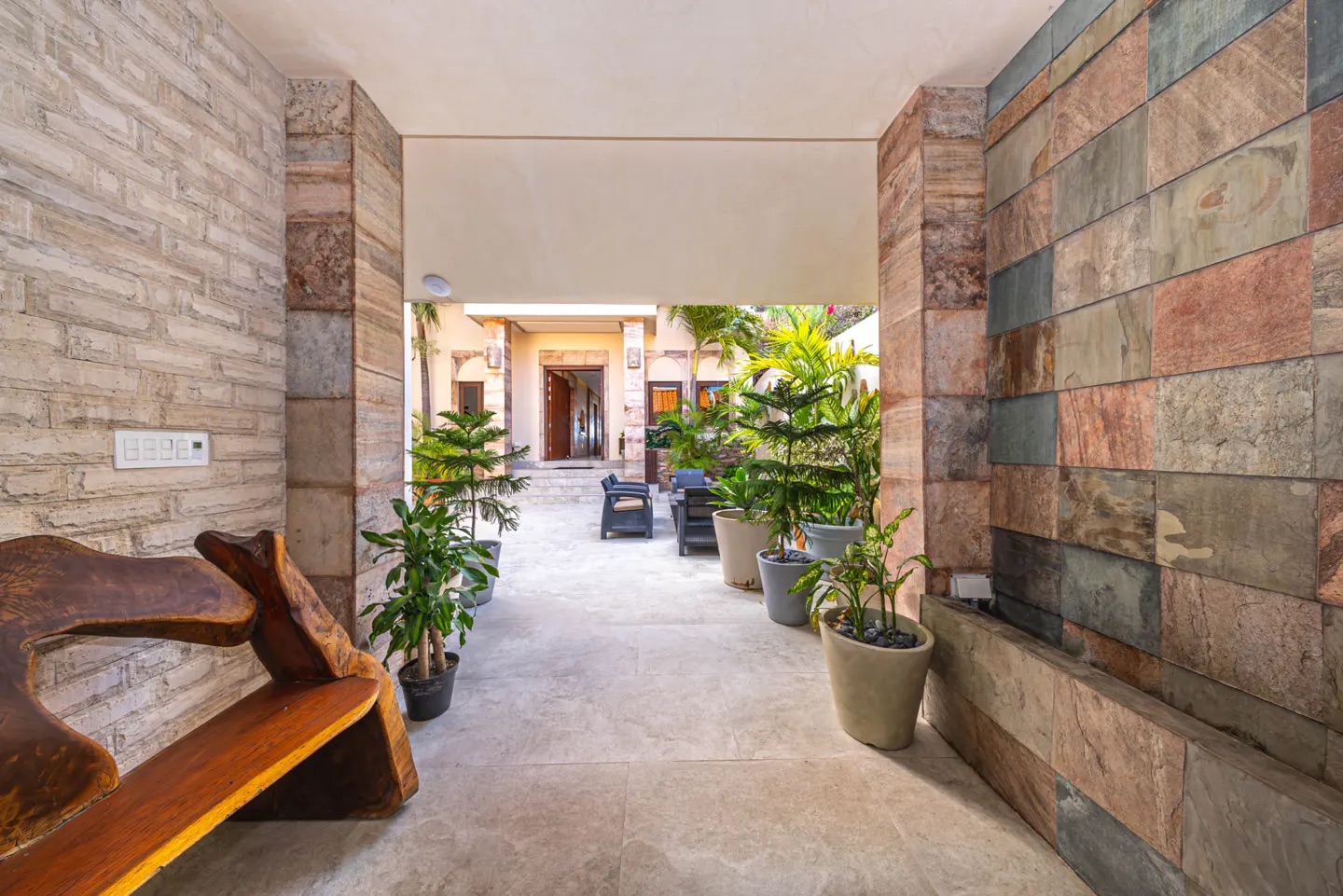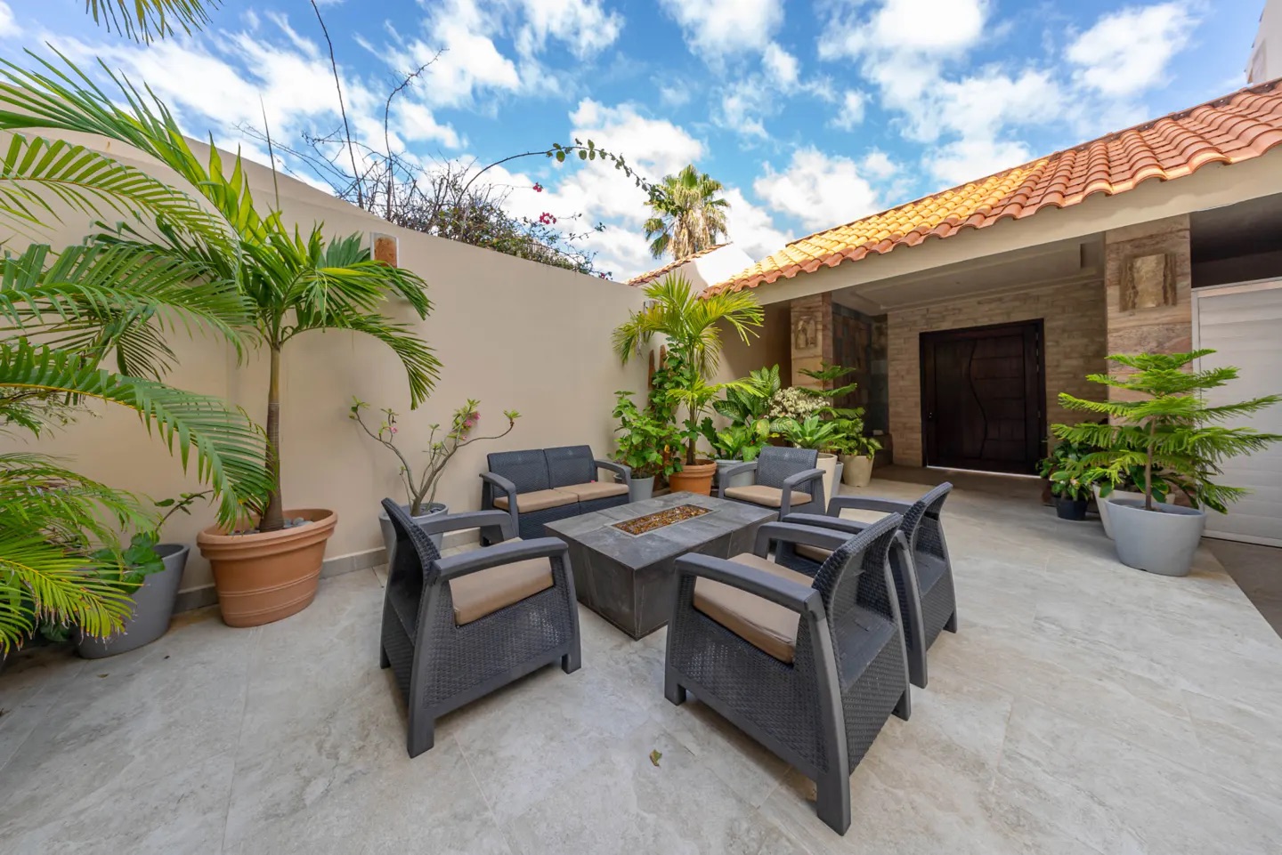 Desde la llegada, la propiedad impone presencia: una elegante rampa conduce a una cochera cerrada para dos autos, mientras que una imponente puerta de madera da paso a un acogedor patio interior con área lounge y fogatero, creando una atmósfera cálida y sofisticada. Sobre el garaje se encuentra un departamento independiente totalmente equipado, ideal para invitados o personal.