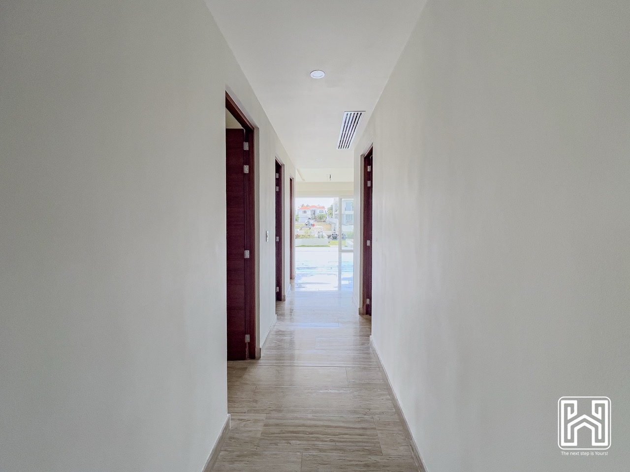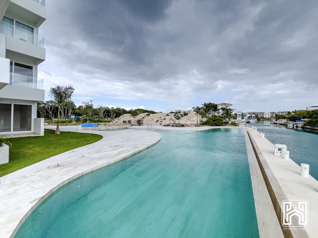 El condominio Puerto Aqua ofrece amenidades de alto nivel como alberca infinity frente al canal, elevador, estacionamientos y muelle para embarcación, todo dentro de una comunidad privada con seguridad 24/7, marina, campo de golf, club de playa y restaurantes.