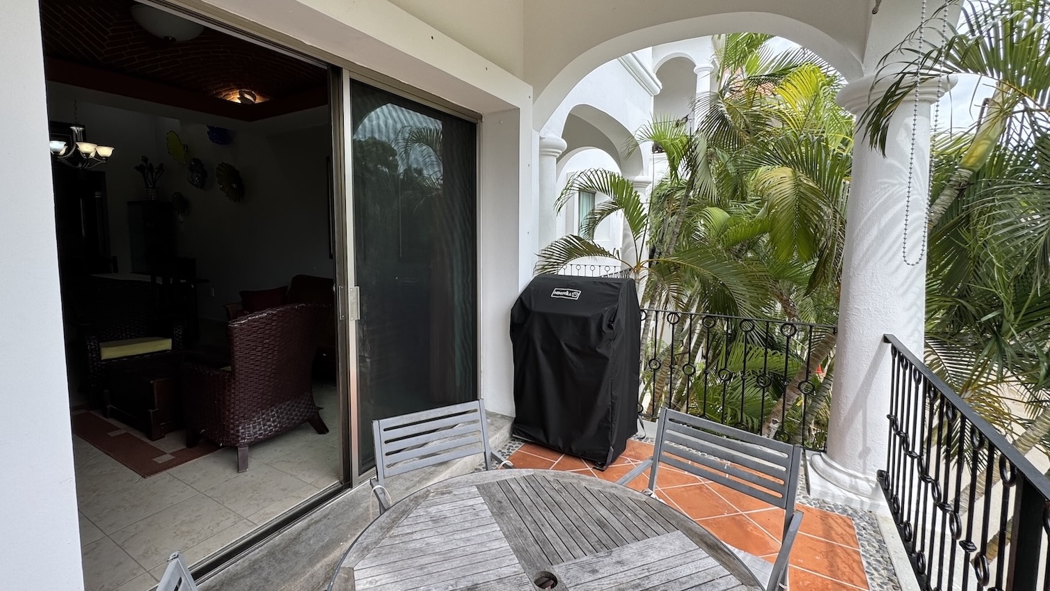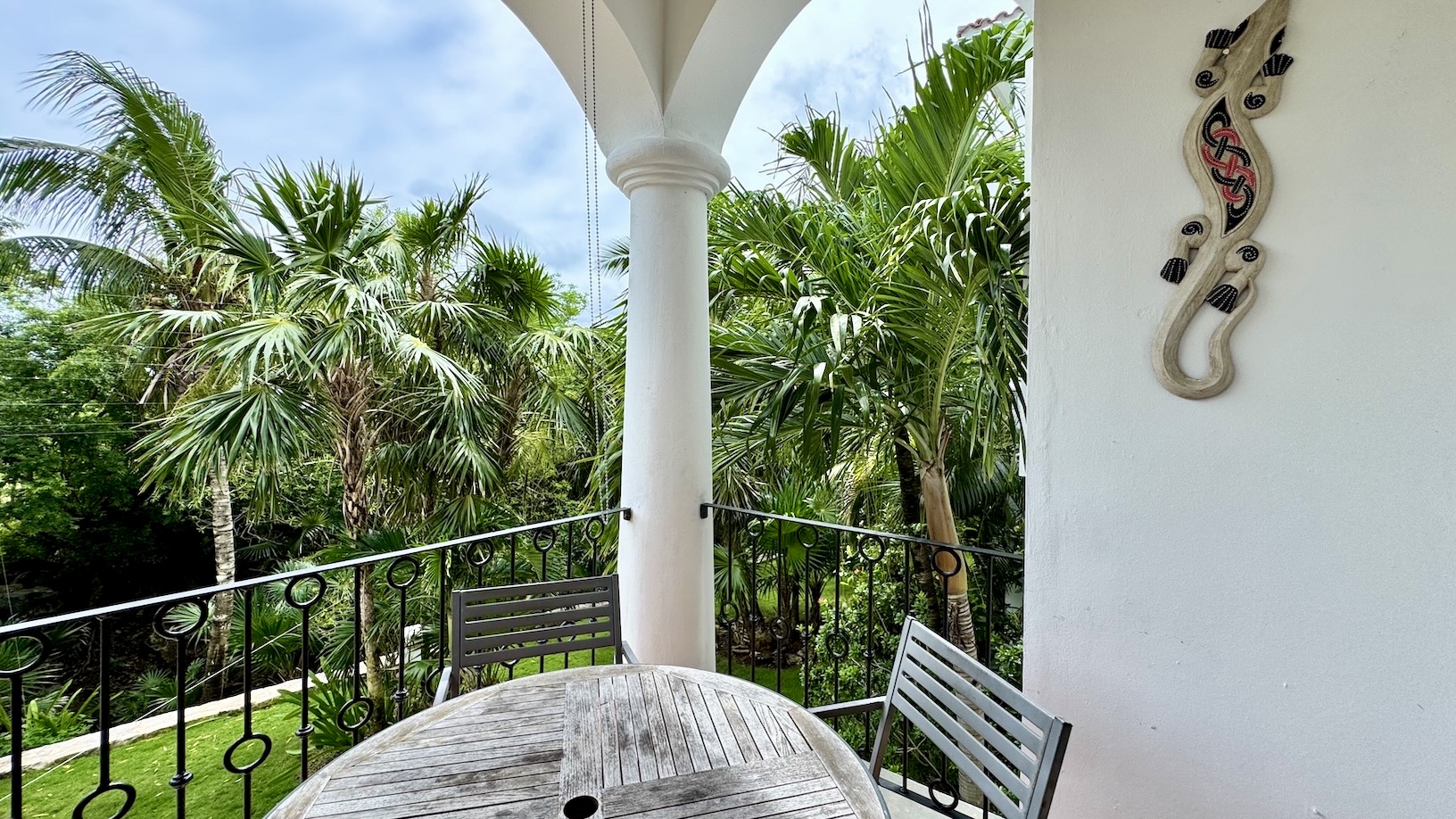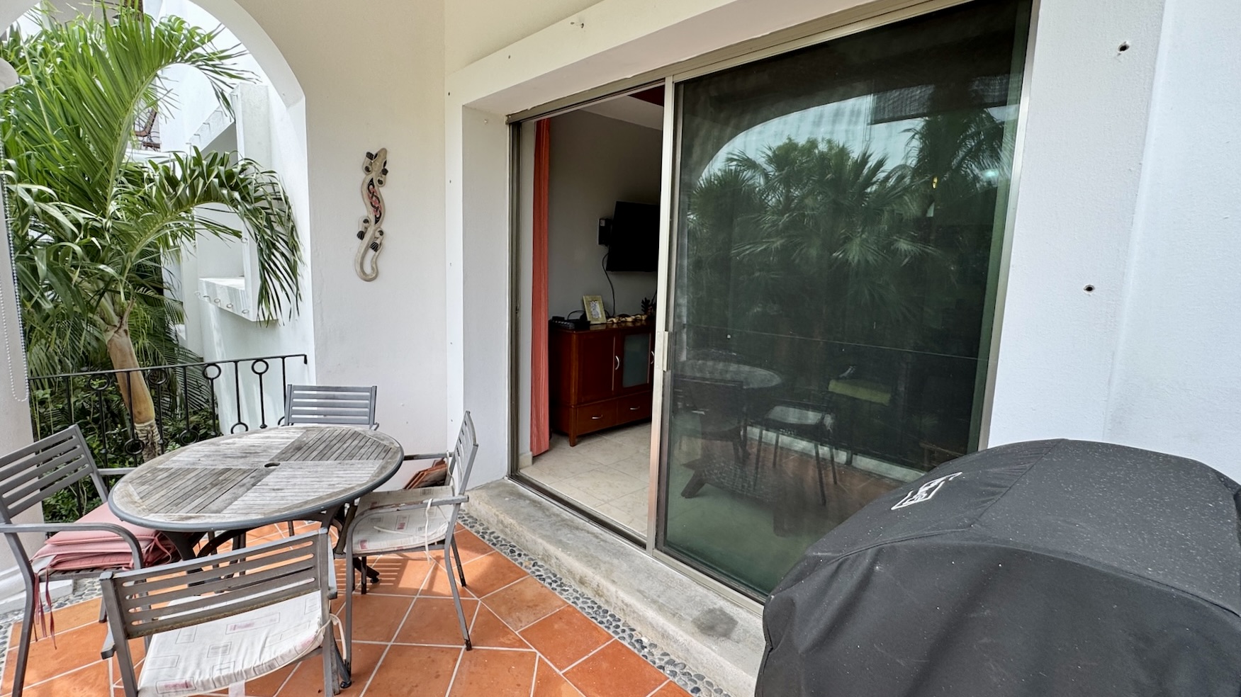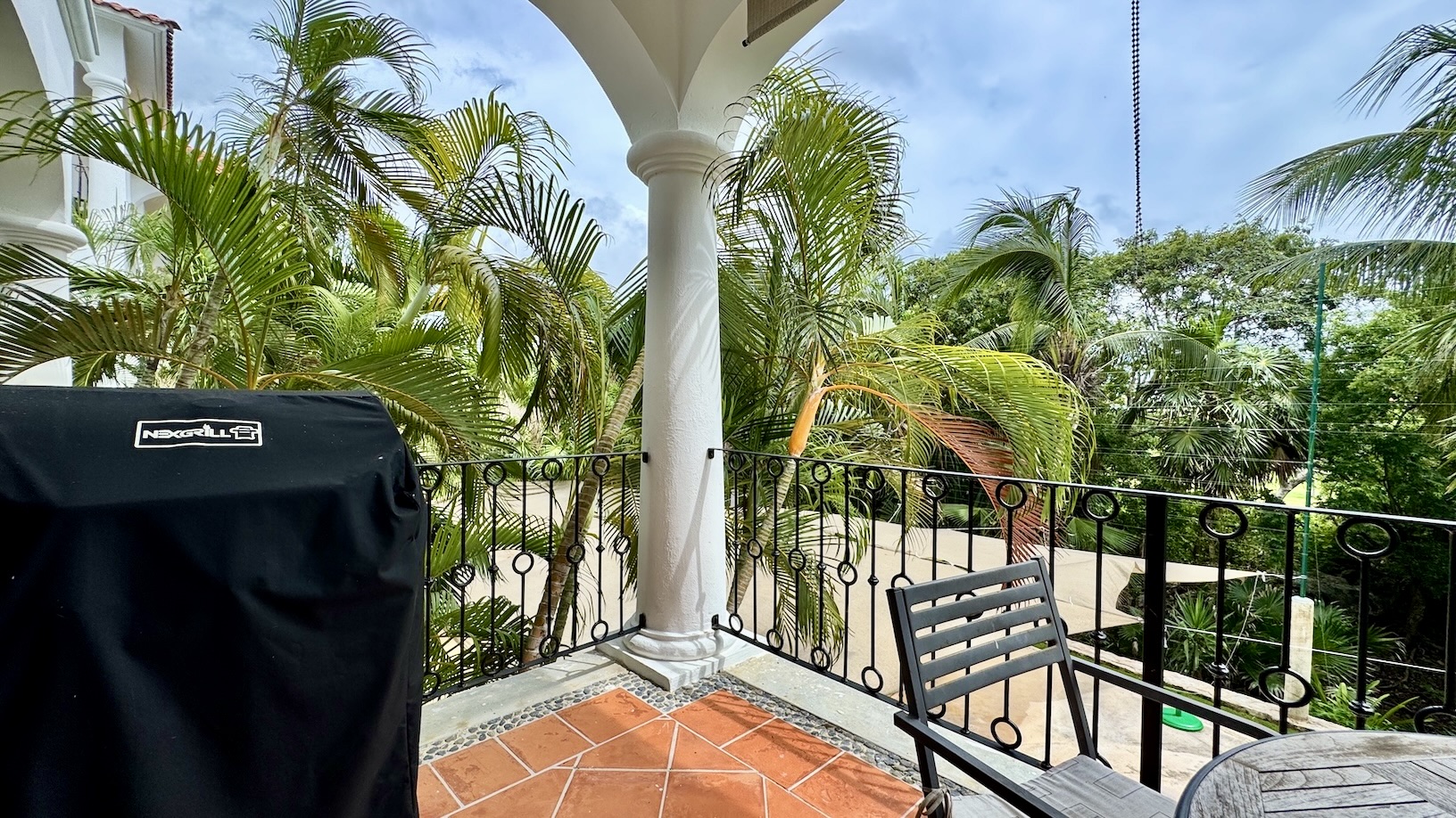 La terraza privada es uno de sus mayores atractivos, con vistas a la alberca y al campo de golf par 3, equipada con parrilla de gas y área de comedor exterior, ideal para disfrutar del clima caribeño en un ambiente relajado.