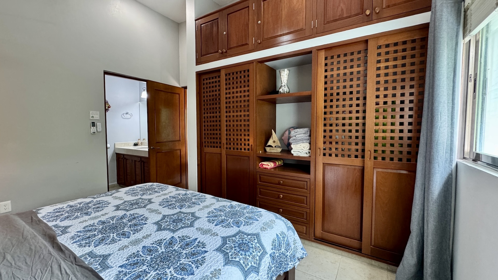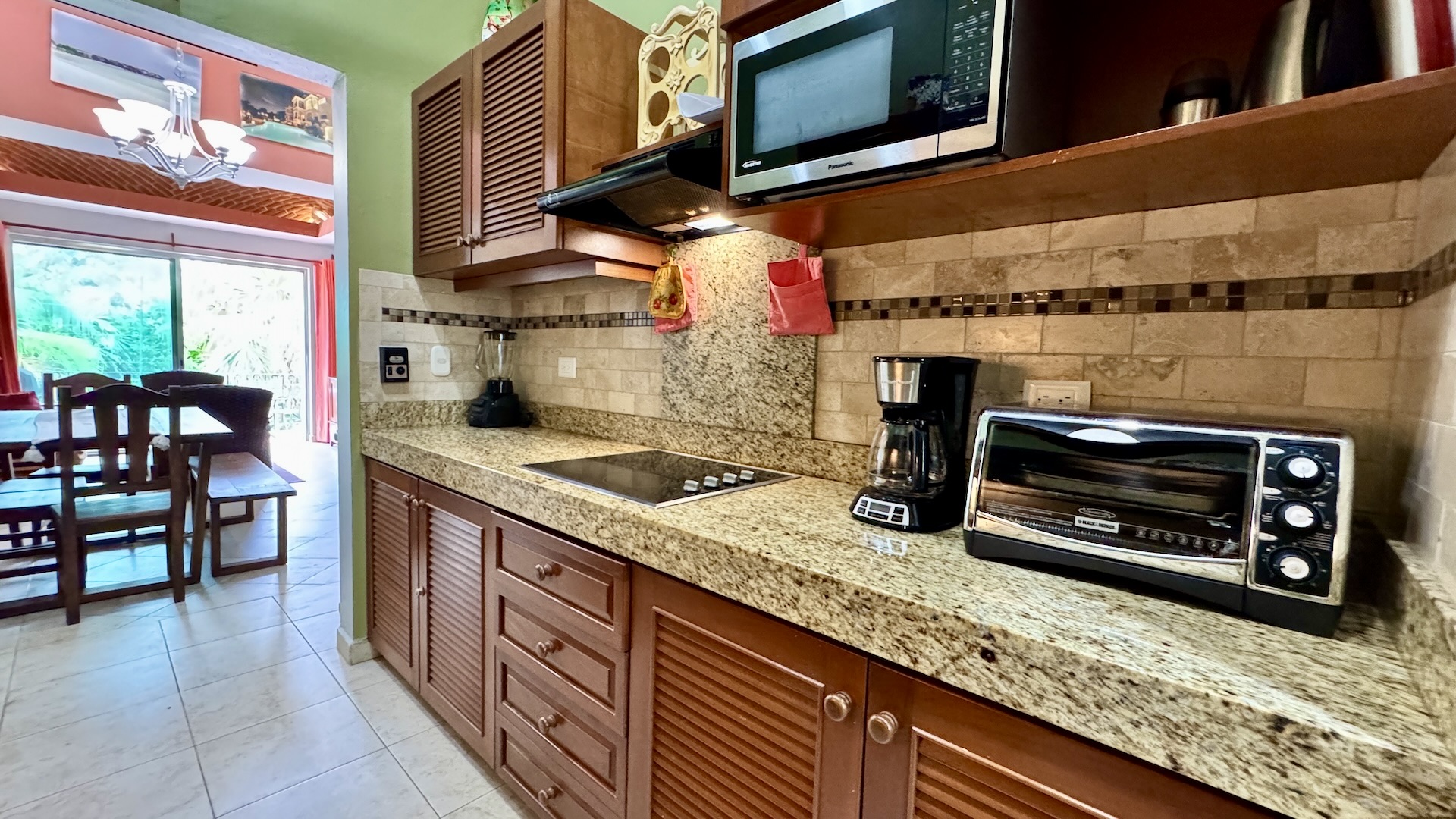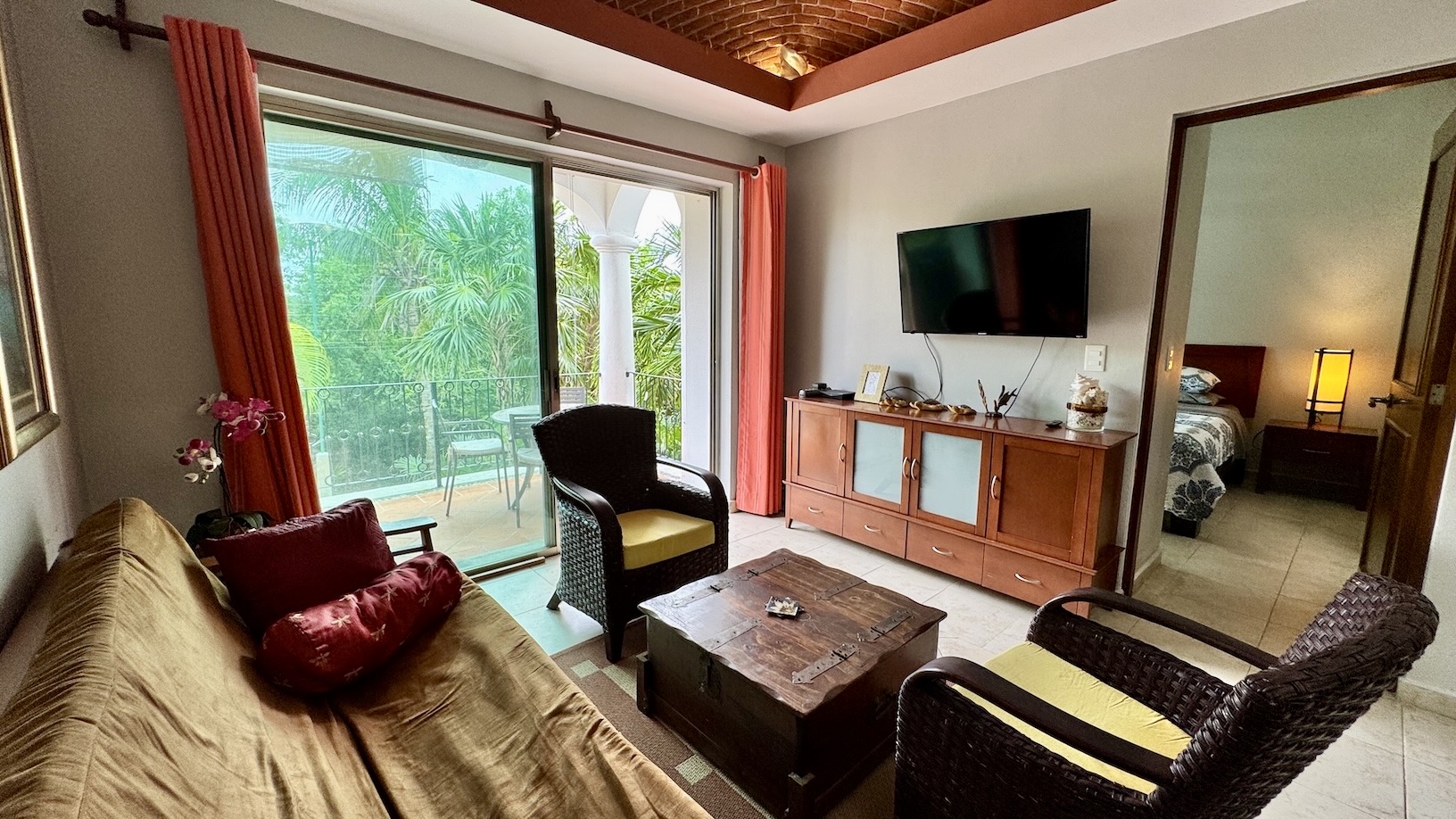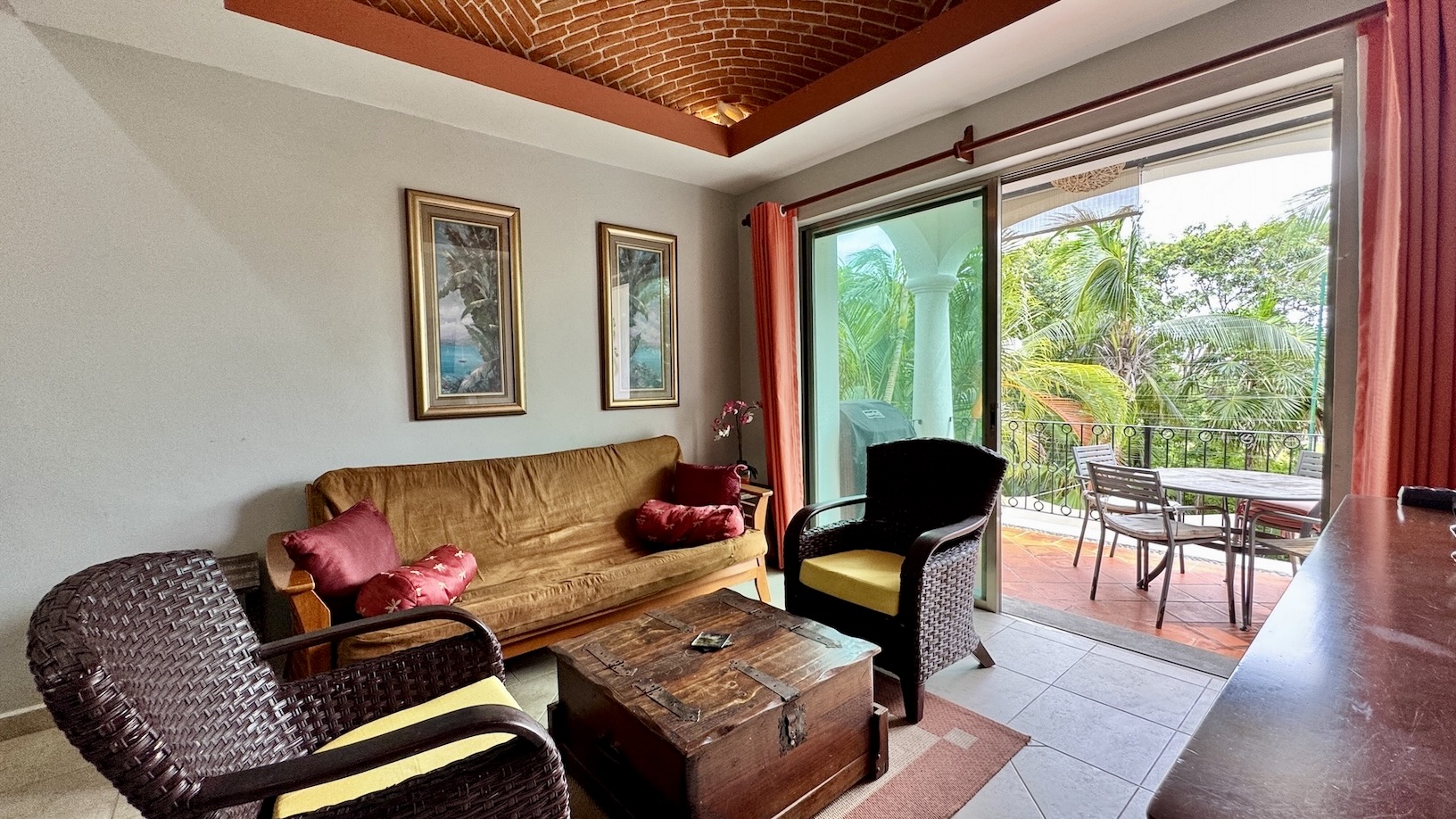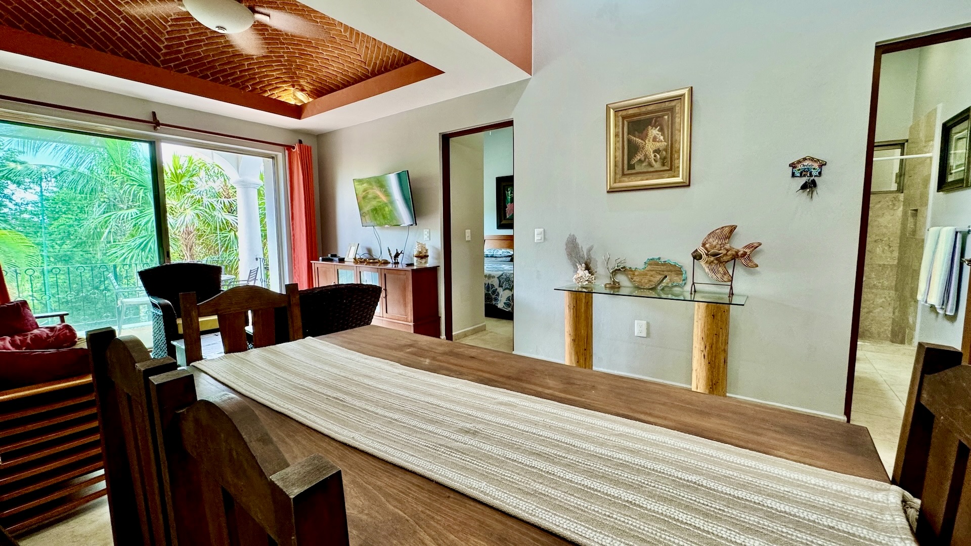 La terraza privada es uno de sus mayores atractivos, con vistas a la alberca y al campo de golf par 3, equipada con parrilla de gas y área de comedor exterior, ideal para disfrutar del clima caribeño en un ambiente relajado.