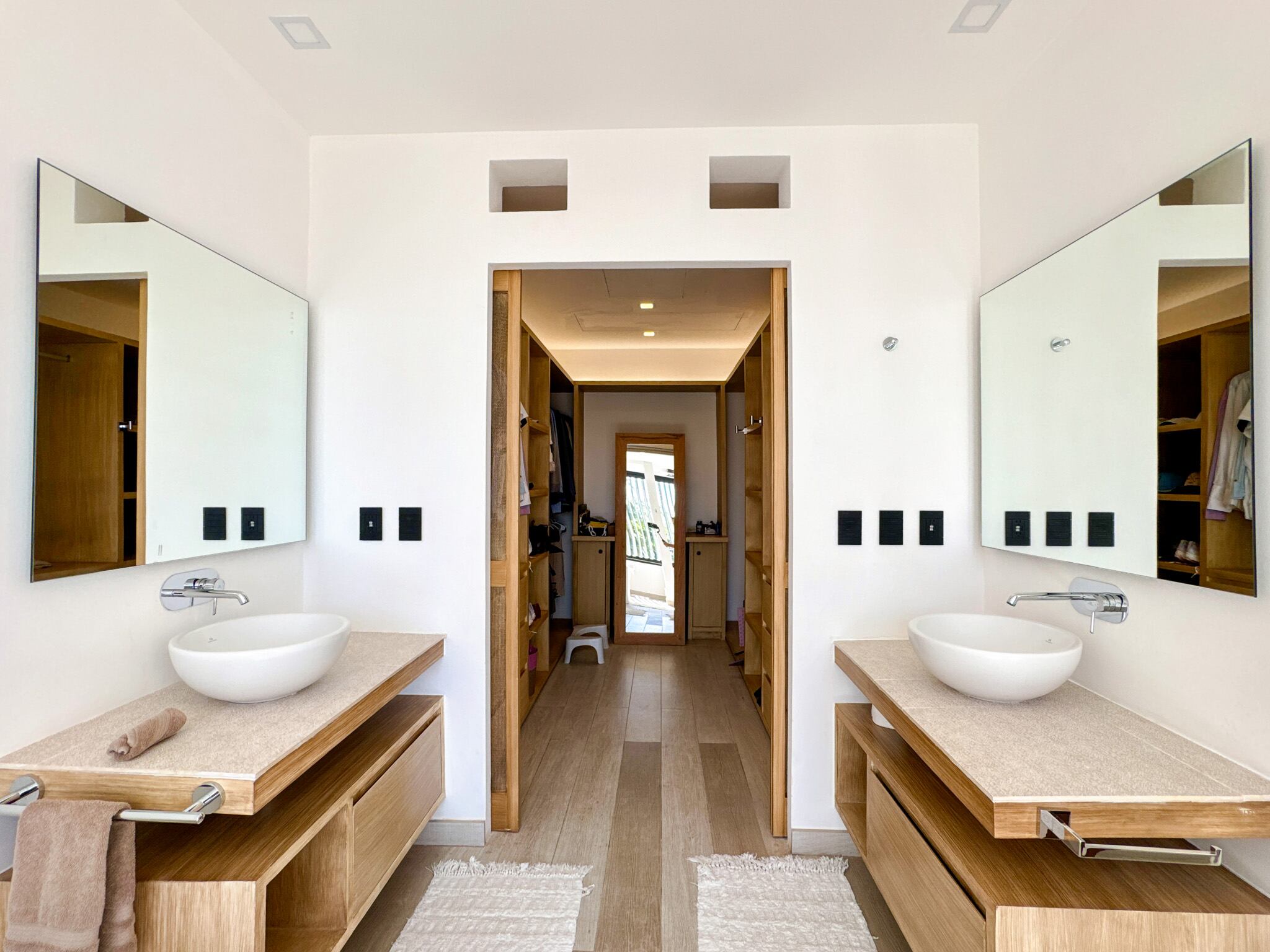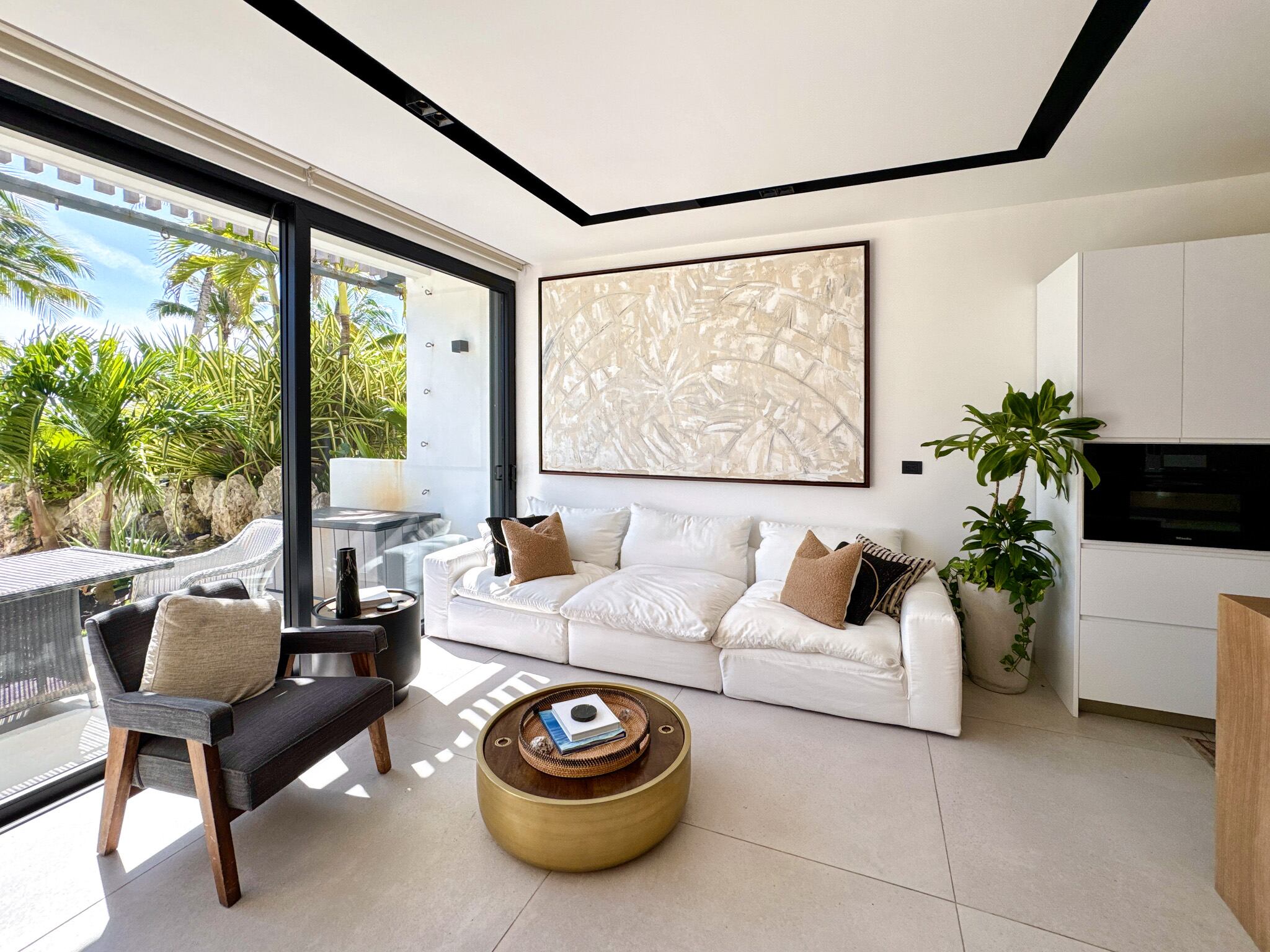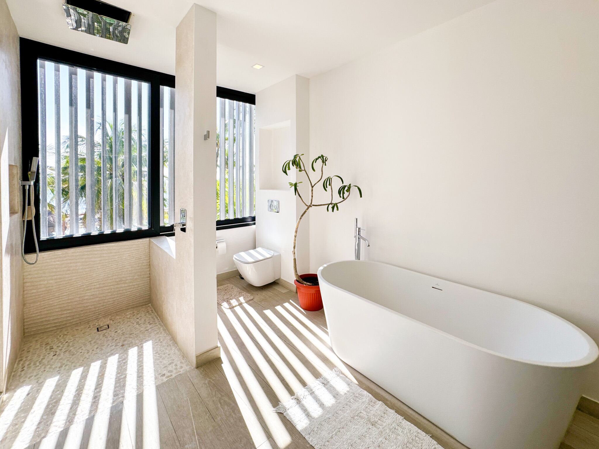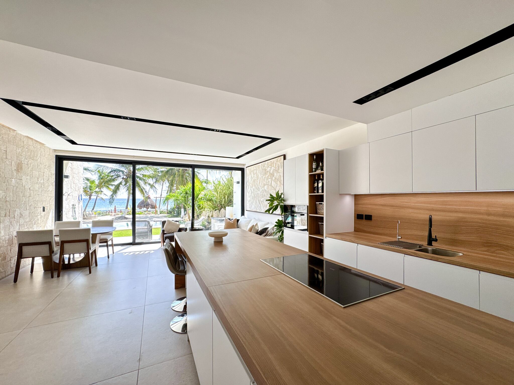 En el nivel superior, la recámara principal se presenta como un verdadero refugio, con terraza privada frente al mar y un baño tipo spa que incluye tina con vista al océano y regadera independiente. La cocina está equipada con electrodomésticos Miele, cubiertas de porcelanato, carpintería a medida con sistema de cierre suave y un sistema de filtración de agua por ósmosis. Los acabados en toda la propiedad, como pisos de mármol pulido o porcelanato y detalles en madera, complementan perfectamente el entorno costero.