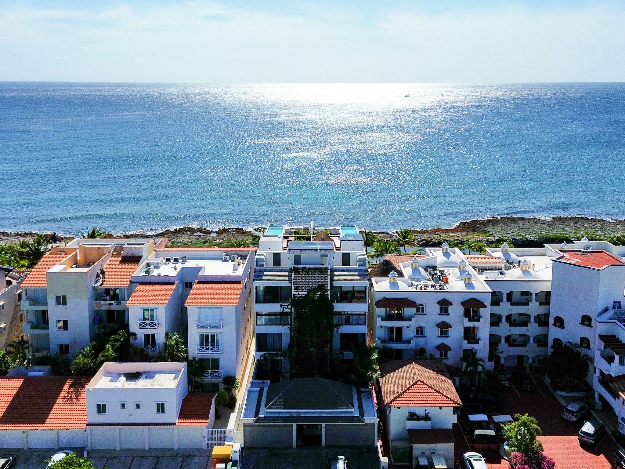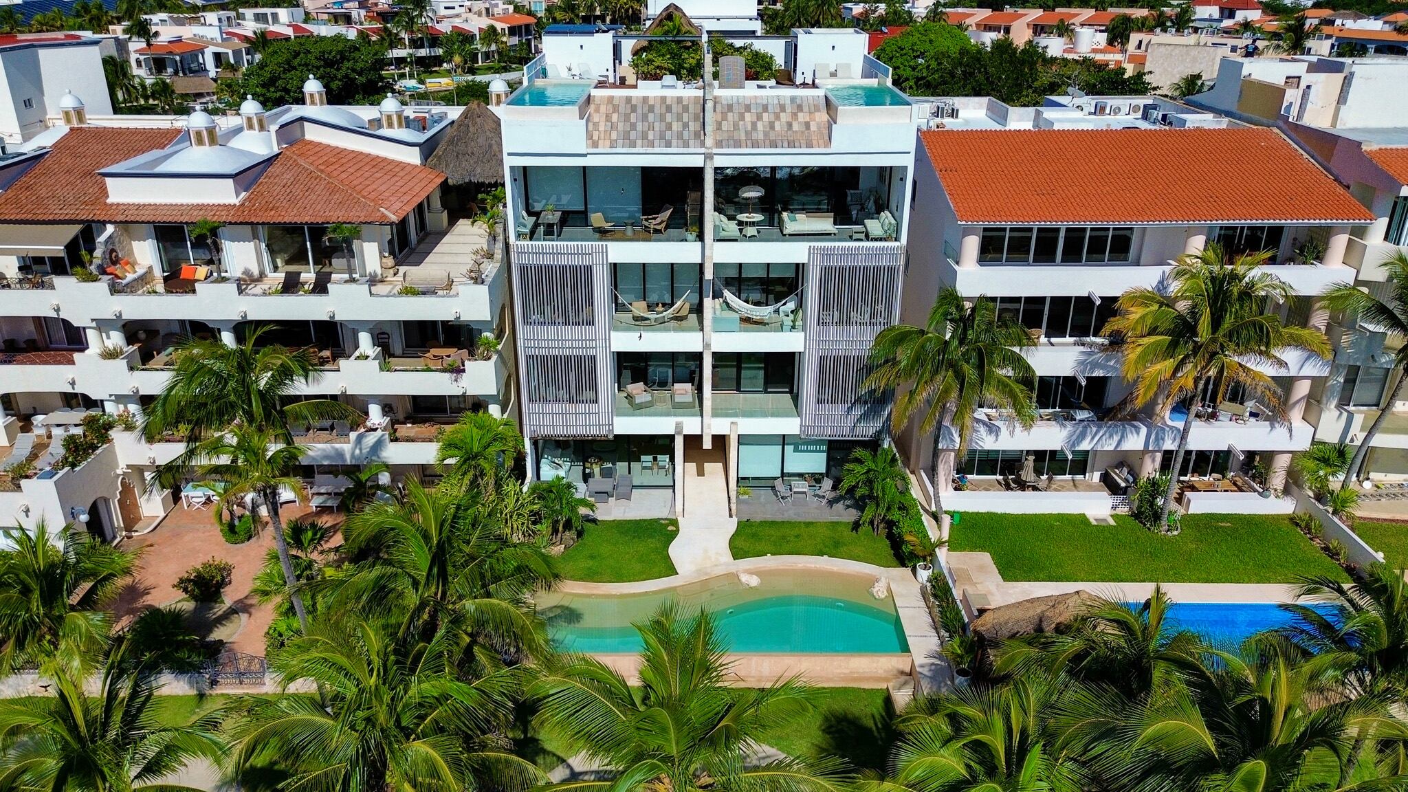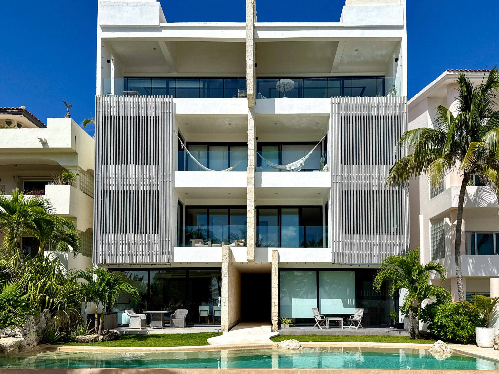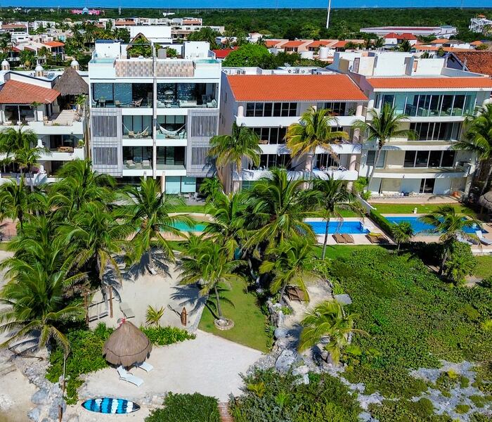 Condominio frente al mar de dos niveles con vistas al Caribe y la laguna, acceso directo a la playa, muelle privado y entrada a la laguna ideal para paddle board y snorkel, elevador exterior y escalera interior, recámara principal con terraza privada y baño tipo spa, cocina equipada con tecnología Miele y acabados de alta gama, cochera techada con estacionamiento asignado, dentro de un edificio boutique de solo cuatro residencias concluido en 2023.