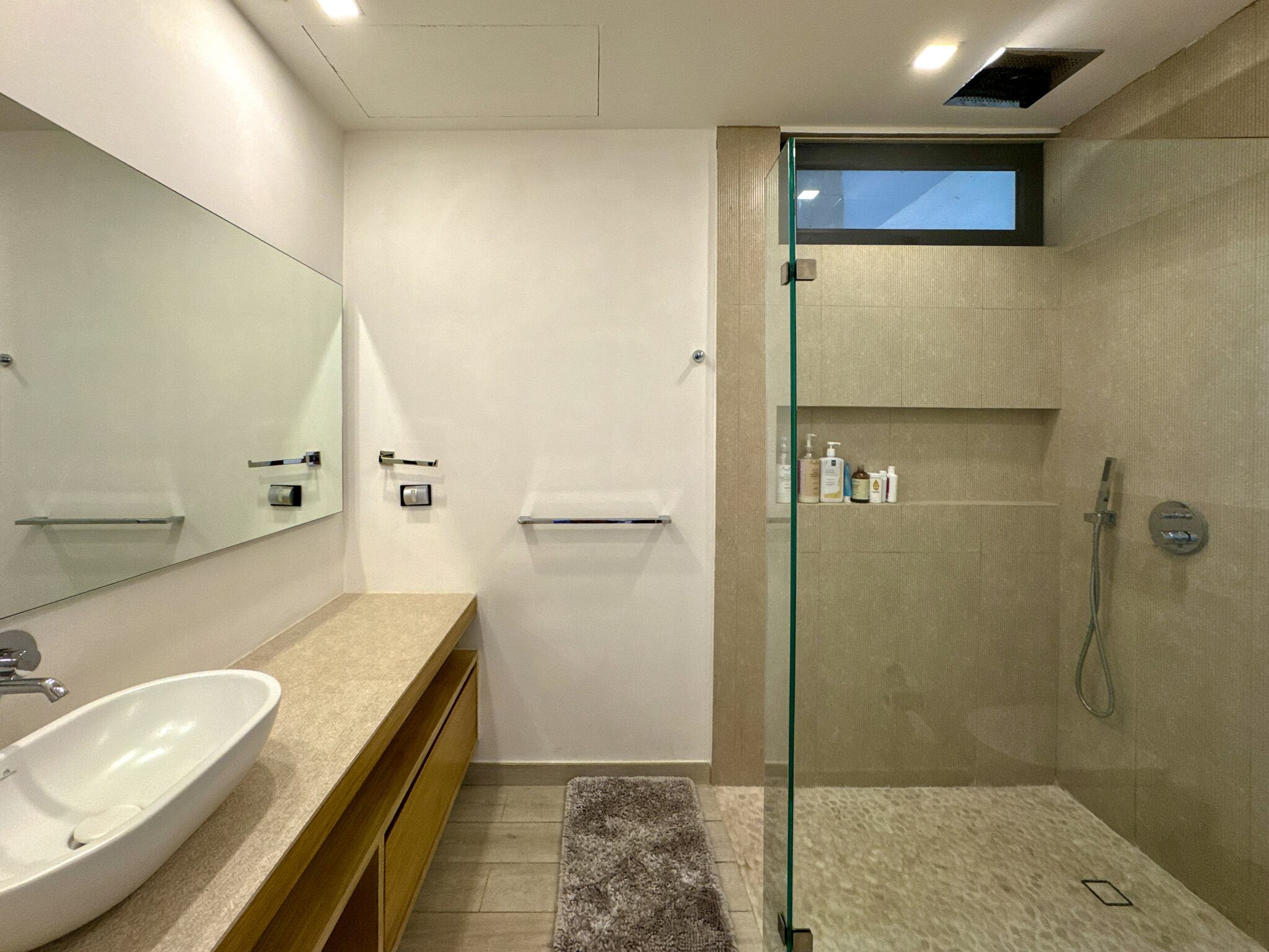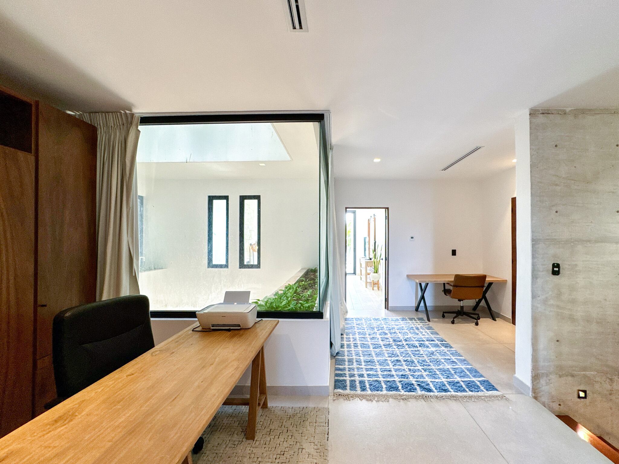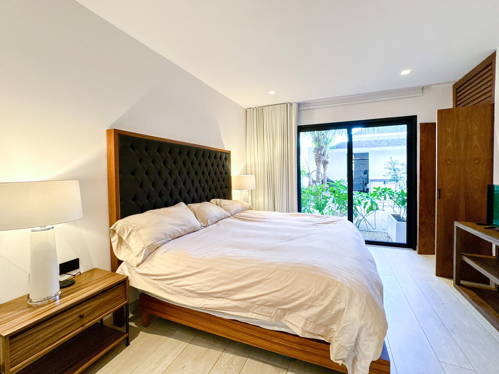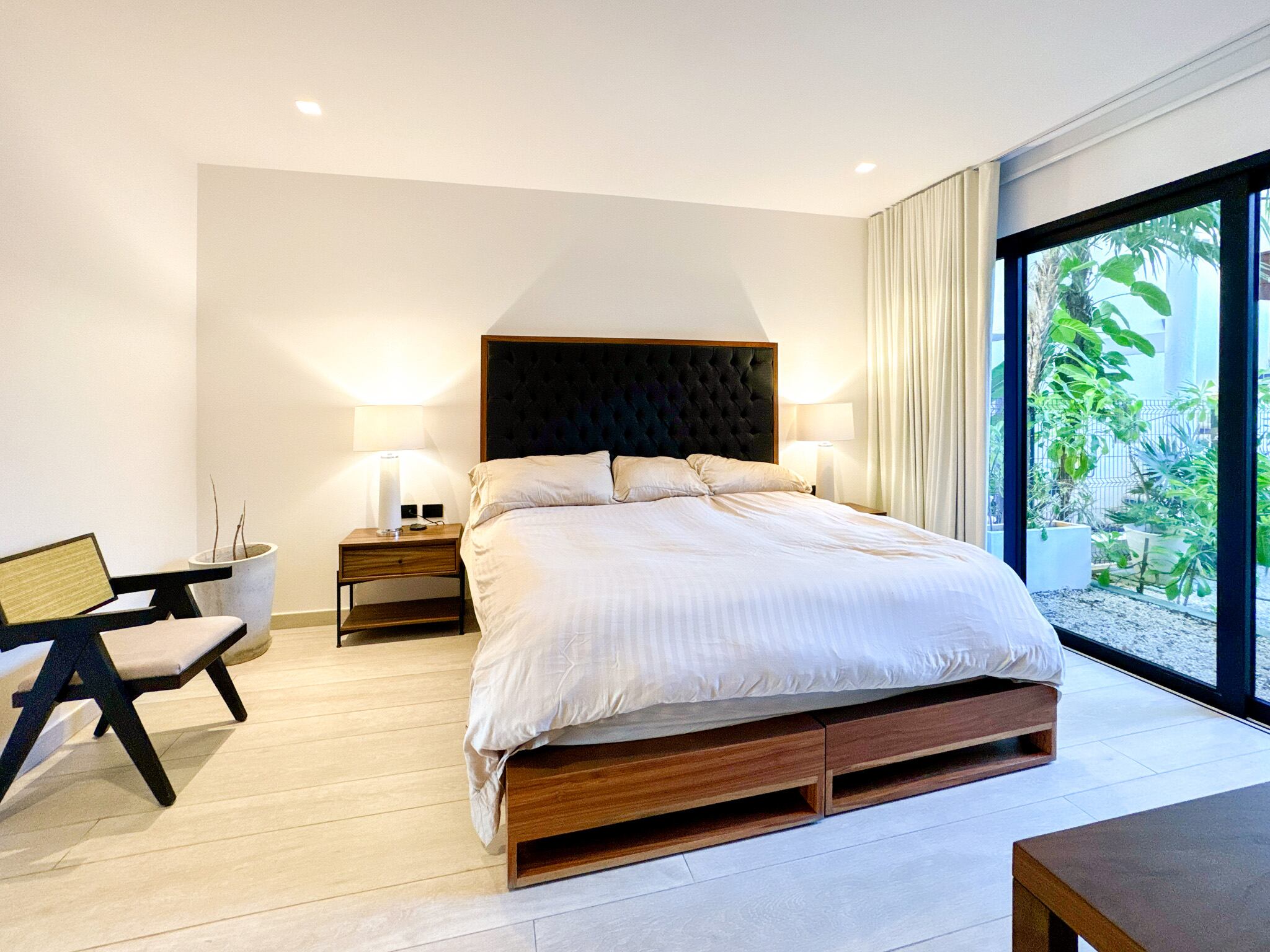 Cuenta con tres amplias recámaras, cuidadosamente distribuidas para brindar privacidad, cada una con baño completo en suite, espacios exteriores propios y generosas áreas de almacenamiento. Una de las recámaras se encuentra en planta baja con vista al jardín, ideal para visitas o para quienes prefieren evitar escaleras. En total, la propiedad dispone de 3.5 baños, además de un espacio adicional que puede funcionar como oficina o sala de medios, equipado con cama Murphy tamaño queen, ofreciendo versatilidad para trabajo remoto o alojamiento de invitados.