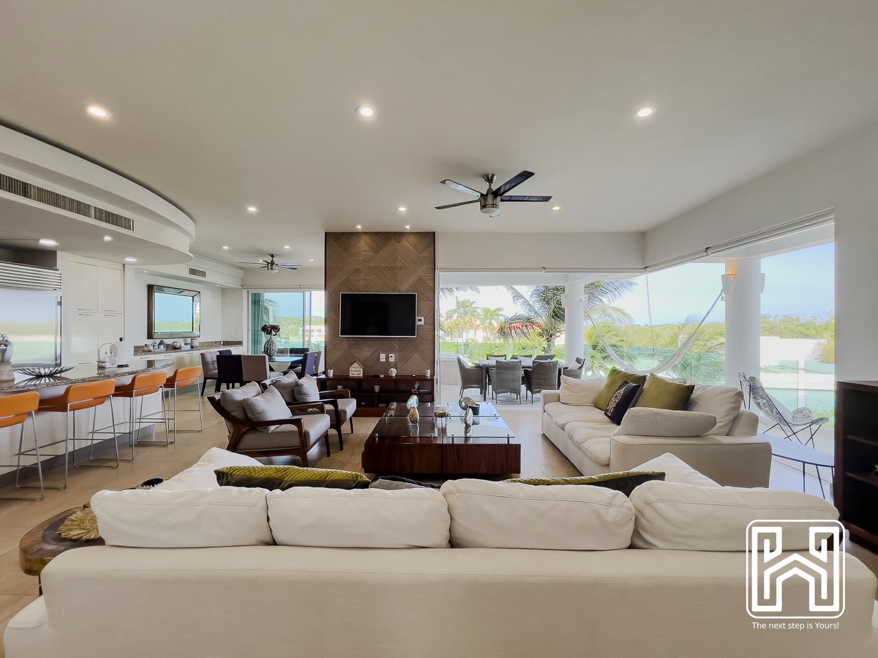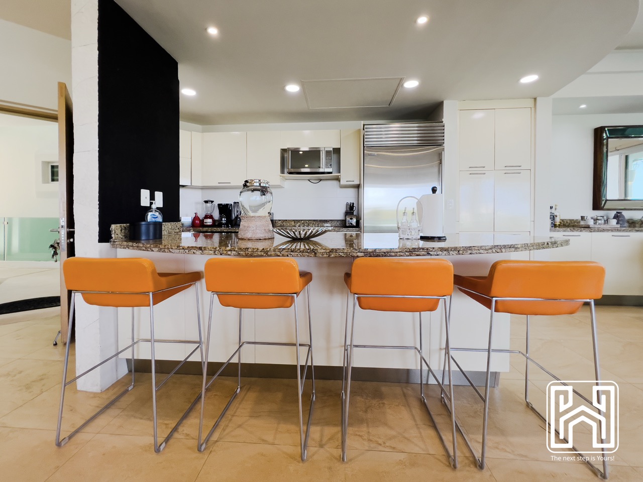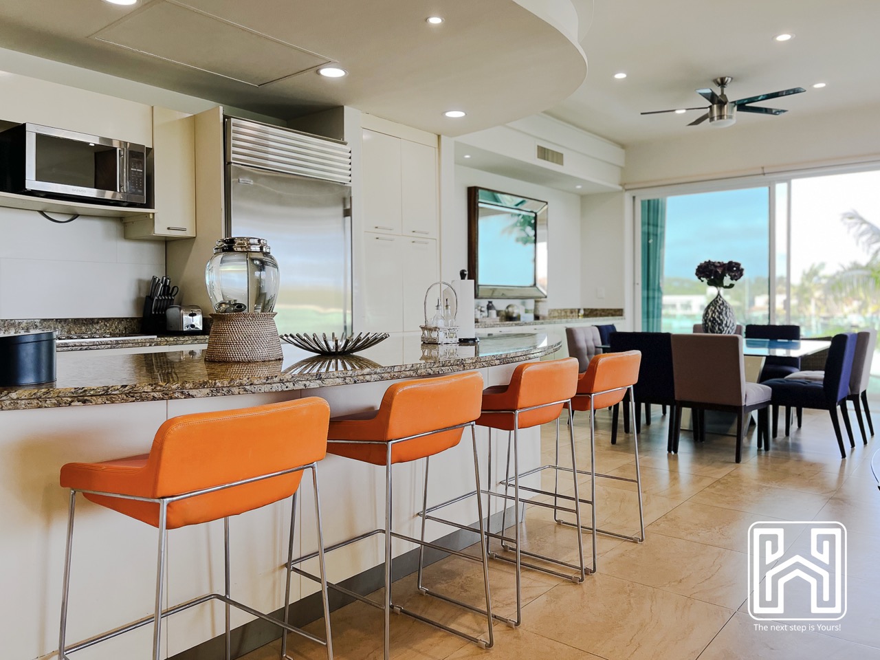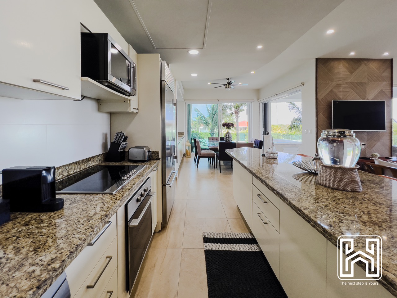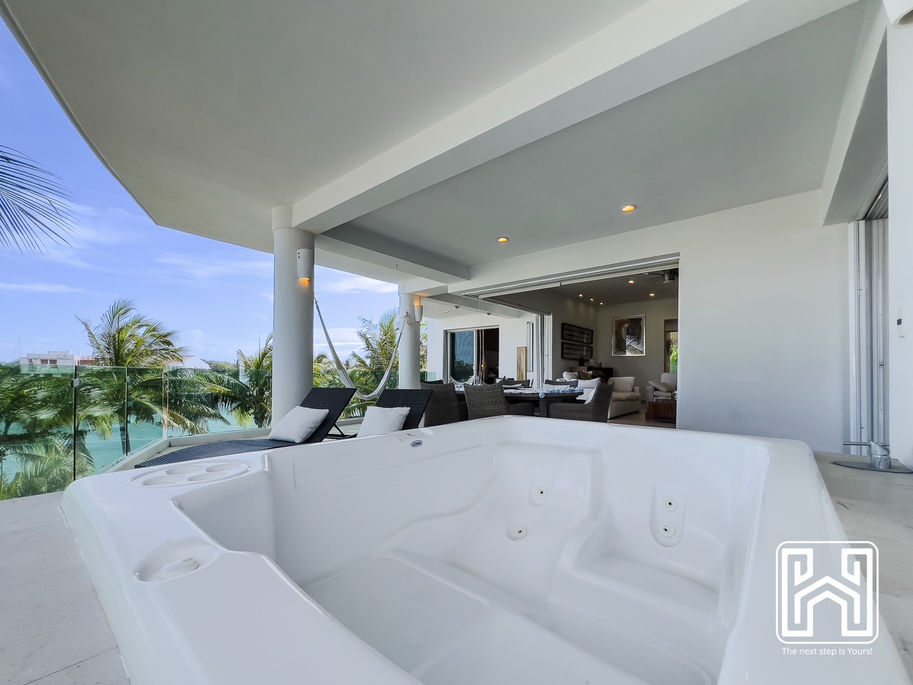 Con una distribución pensada para el confort y el estilo, la propiedad cuenta con tres recámaras, tres baños completos y un medio baño, además de generosas terrazas privadas con vistas panorámicas hacia el canal y el mar Caribe. El jacuzzi en la terraza brinda un espacio íntimo para relajarse bajo las estrellas, mientras que la cocina de diseño contemporáneo, equipada con electrodomésticos de alta gama y barra en península, es ideal tanto para la vida diaria como para recibir invitados.