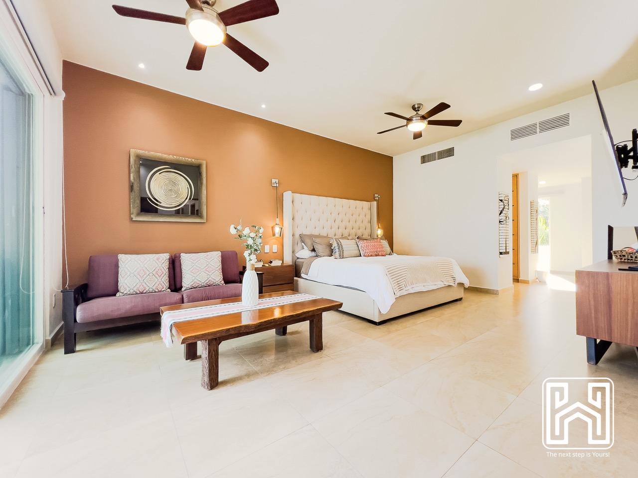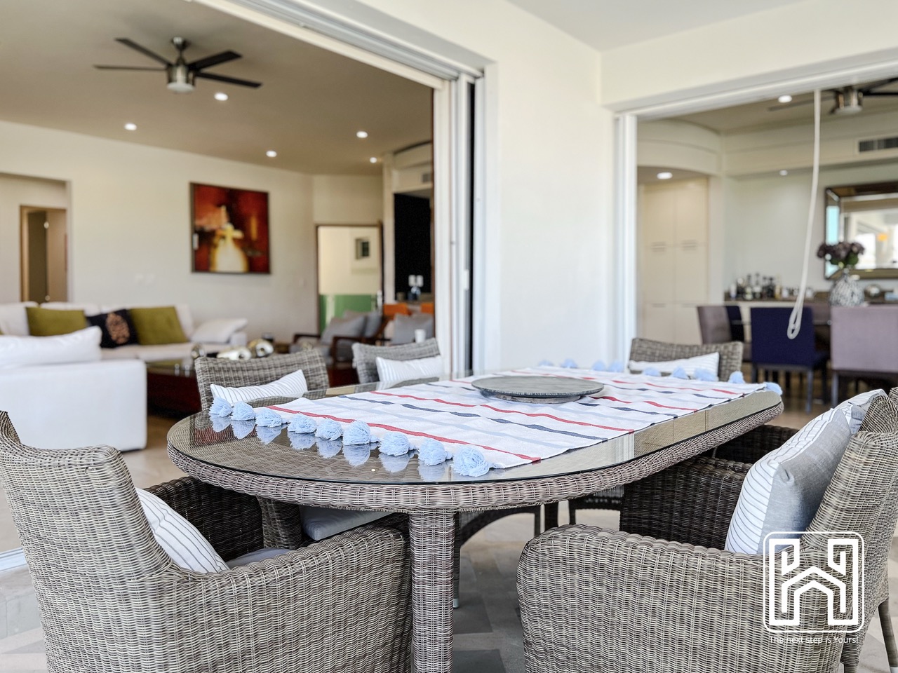 La sala principal es luminosa y abierta, con ventanales que permiten la entrada de luz natural y una conexión directa con el entorno exterior. El comedor, de estilo sobrio y elegante, está amueblado con piezas de madera de alta calidad. La recámara principal ofrece vestidor, baño en suite y salida directa a la terraza. Las recámaras secundarias cuentan también con baño privado y acabados de lujo.