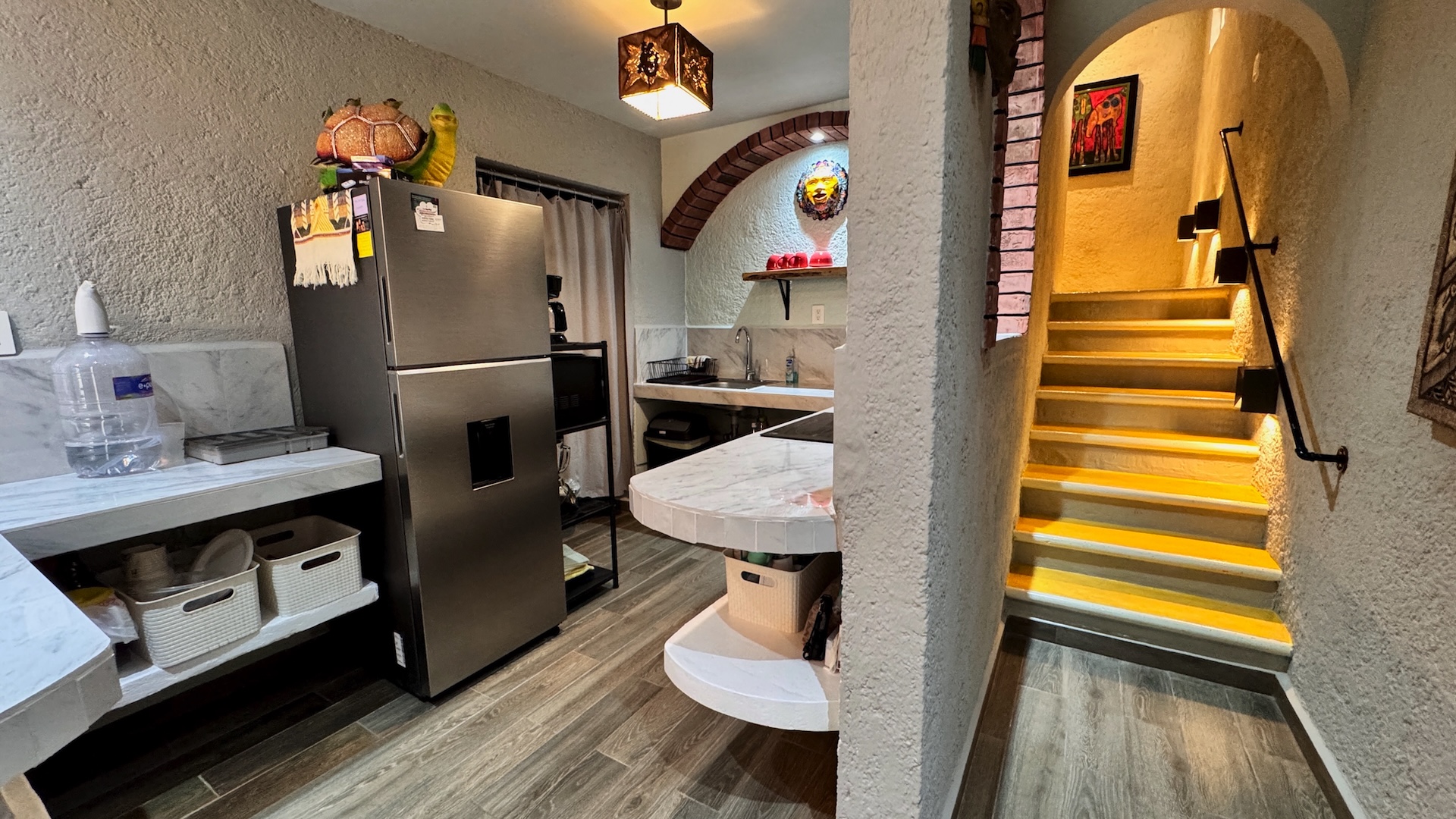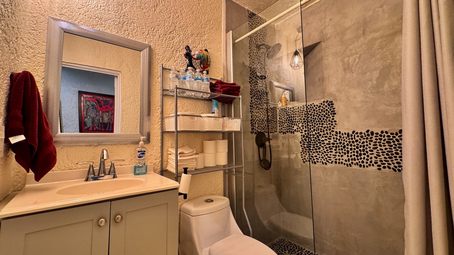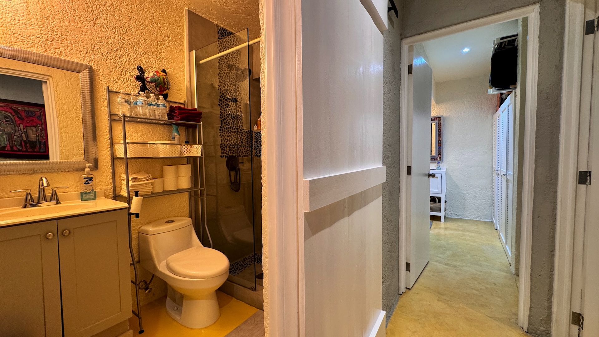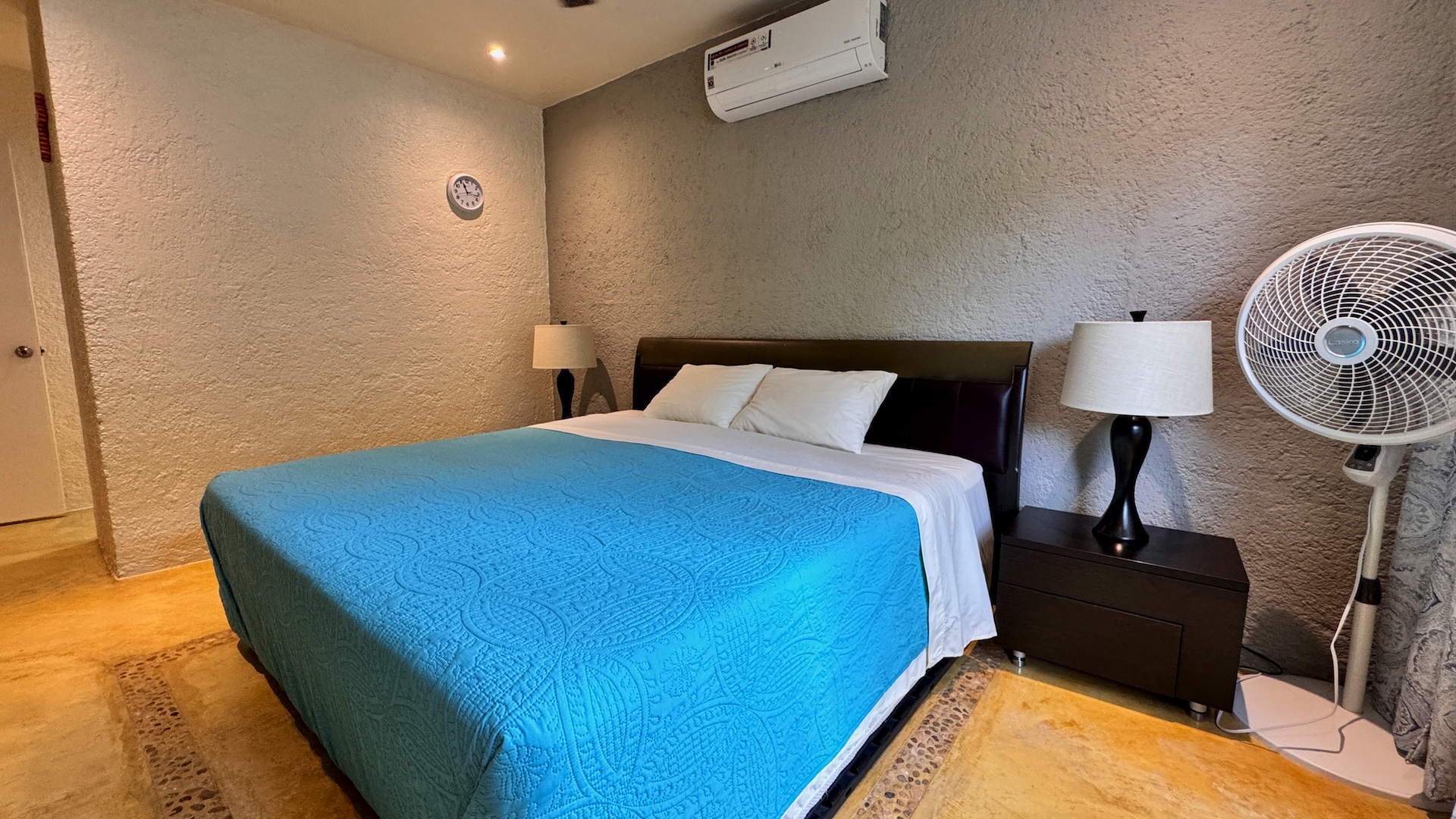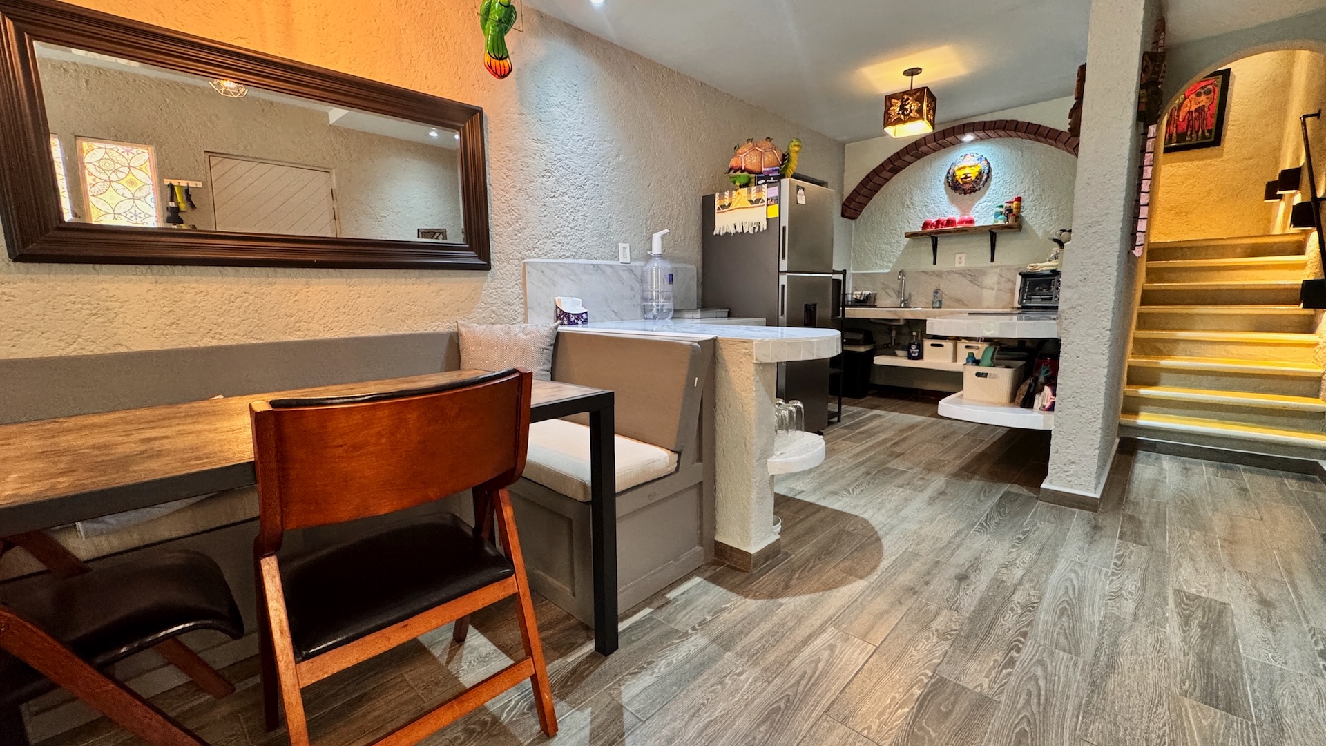 El townhouse ofrece dos recámaras y dos baños completos. La recámara de invitados es luminosa y cómoda, con acceso a baño completo, mientras que la recámara principal cuenta con baño privado y una regadera tipo walk-in con detalles en piedra natural que aportan un toque cálido y distintivo.