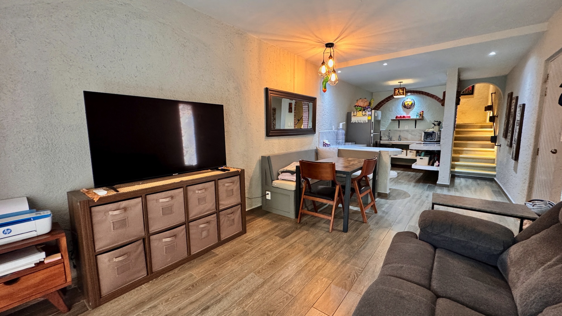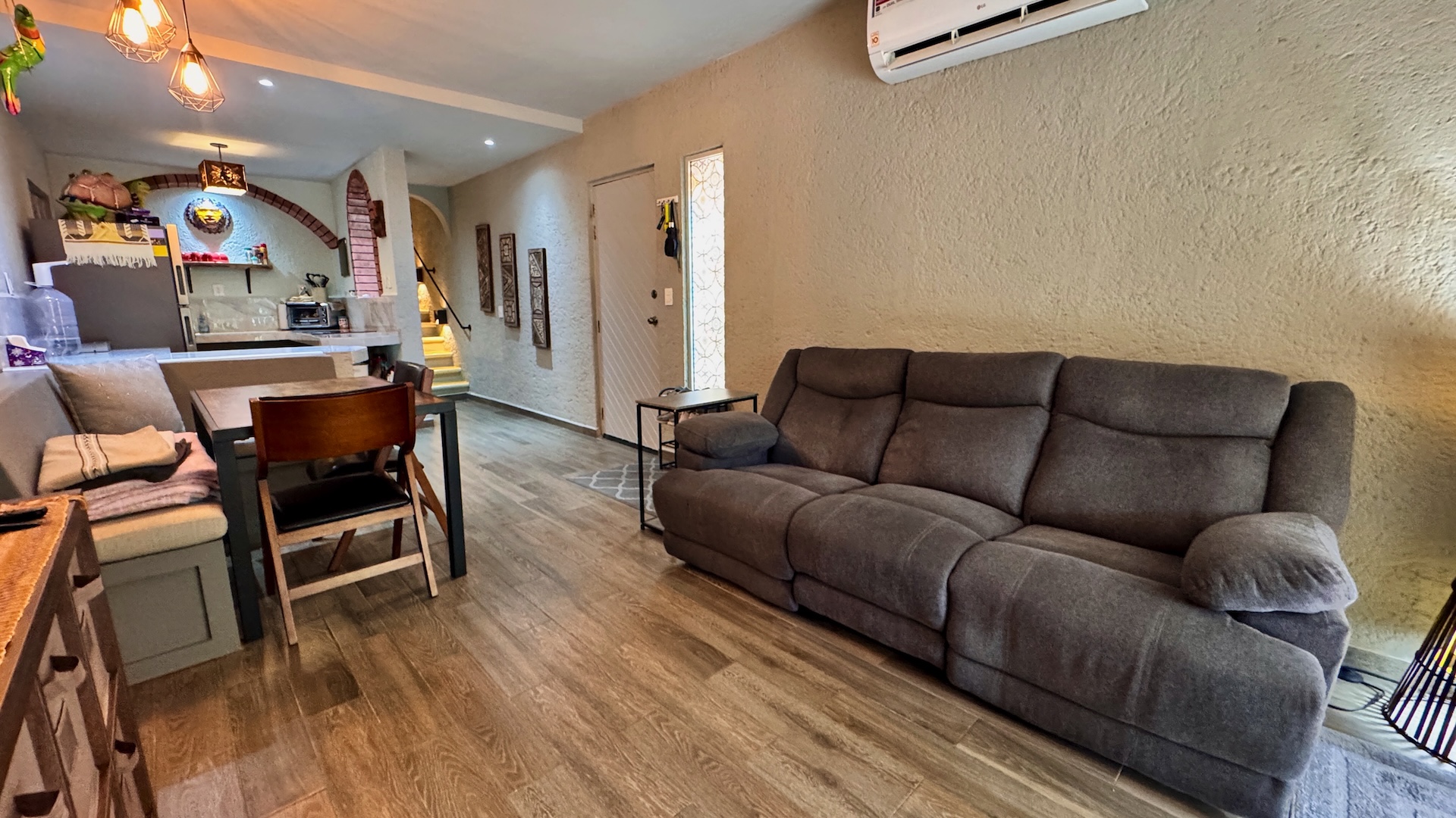 En su interior, la propiedad cuenta con una distribución funcional de concepto abierto que integra sala, comedor y cocina, creando un ambiente cómodo y bien aprovechado. Se entrega completamente amueblada y equipada, incluyendo utensilios de cocina y ropa de cama, lista para mudarse o comenzar a generar ingresos. Dispone de área de lavandería y espacios de almacenamiento, aportando practicidad para el día a día.