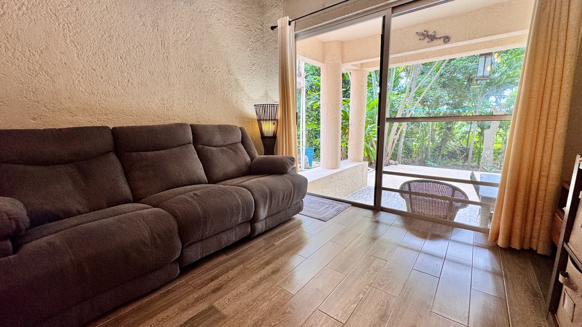 En la parte posterior, una agradable terraza techada se abre hacia el campo de golf par 3, rodeado de vegetación tropical que atrae fauna local, creando un entorno relajante y lleno de vida. Es el espacio perfecto para disfrutar de un café por la mañana o una bebida al atardecer en total tranquilidad.